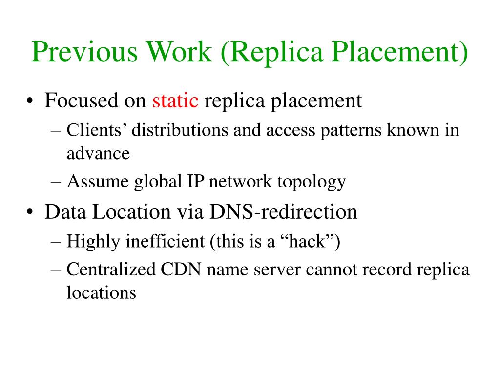 Previous Work (Replica Placement) • Focused on static replica placement • Clients’ distributions and access patterns known in advance • Assume global IP network topology • Data Location via DNS-redirection • Highly inefficient (this is a “hack”) • Centralized CDN name server cannot record replica locations