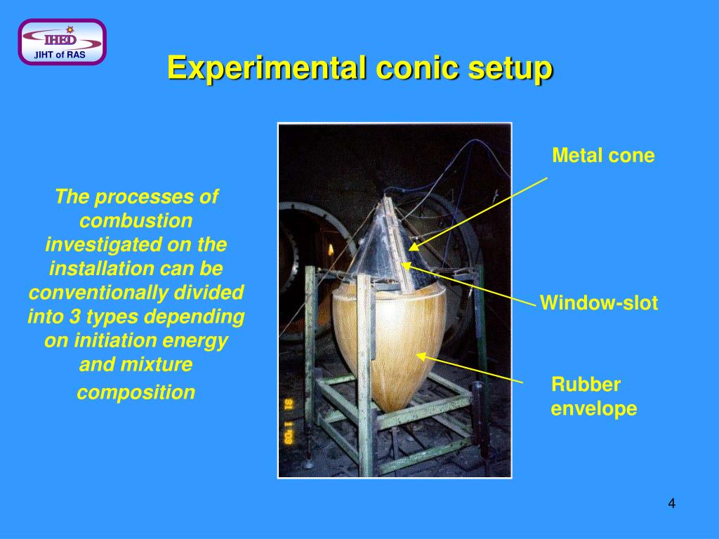 JIHT of RAS Experimental conic setup Metal cone The processes of combustion investigated on the installation can be conventionally divided into 3 types depending on initiation energy and mixture composition Window-slot Rubber envelope