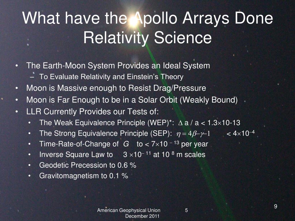What have the Apollo Arrays DoneRelativity Science • The Earth-Moon System Provides an Ideal System • To Evaluate Relativity and Einstein’s Theory • Moon is Massive enough to Resist Drag/Pressure • Moon is Far Enough to be in a Solar Orbit (Weakly Bound) • LLR Currently Provides our Tests of: • The Weak Equivalence Principle (WEP)*: a / a < 1.310-13 • The Strong Equivalence Principle (SEP): < 4104 • Time-Rate-of-Change of G to < 710 13 per year • Inverse Square Law to 3 10 11 at 10 8 m scales • Geodetic Precession to 0.6 % • Gravitomagnetism to 0.1 % American Geophysical Union 5 December 2011