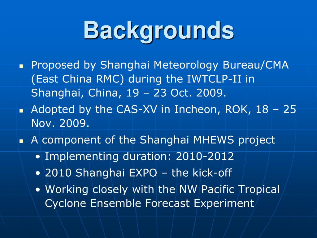 Backgrounds • Proposed by Shanghai Meteorology Bureau/CMA (East China RMC) during the IWTCLP-II in Shanghai, China, 19 – 23 Oct. 2009. • Adopted by the CAS-XV in Incheon, ROK, 18 – 25 Nov. 2009. • A component of the Shanghai MHEWS project • Implementing duration: 2010-2012 • 2010 Shanghai EXPO – the kick-off • Working closely with the NW Pacific Tropical Cyclone Ensemble Forecast Experiment