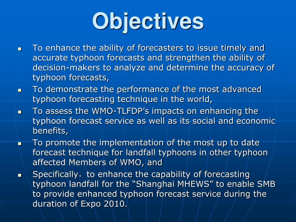 Objectives • To enhance the ability of forecasters to issue timely and accurate typhoon forecasts and strengthen the ability of decision-makers to analyze and determine the accuracy of typhoon forecasts, • To demonstrate the performance of the most advanced typhoon forecasting technique in the world, • To assess the WMO-TLFDP’s impacts on enhancing the typhoon forecast service as well as its social and economic benefits, • To promote the implementation of the most up to date forecast technique for landfall typhoons in other typhoon affected Members of WMO, and • Specifically,to enhance the capability of forecasting typhoon landfall for the “Shanghai MHEWS” to enable SMB to provide enhanced typhoon forecast service during the duration of Expo 2010.