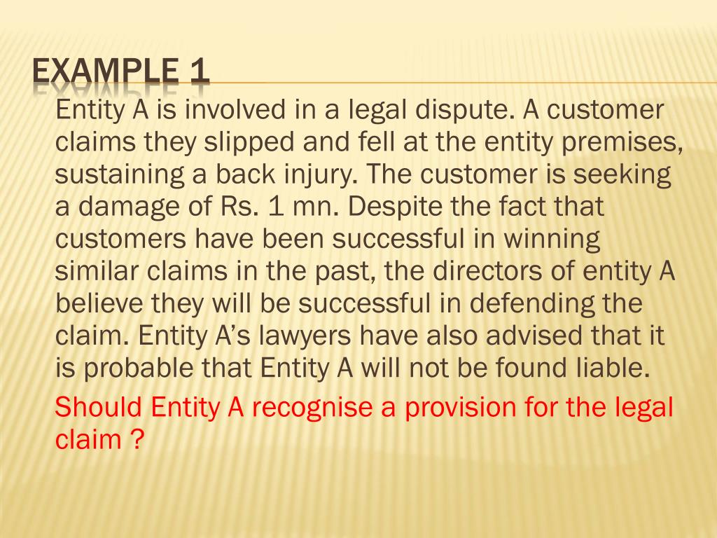 Entity A is involved in a legal dispute. A customer claims they slipped and fell at the entity premises, sustaining a back injury. The customer is seeking a damage of Rs. 1 mn. Despite the fact that customers have been successful in winning similar claims in the past, the directors of entity A believe they will be successful in defending the claim. Entity A’s lawyers have also advised that it is probable that Entity A will not be found liable. Should Entity A recognise a provision for the legal claim ? Example 1