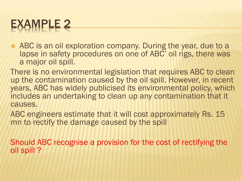 ABC is an oil exploration company. During the year, due to a lapse in safety procedures on one of ABC’ oil rigs, there was a major oil spill. There is no environmental legislation that requires ABC to clean up the contamination caused by the oil spill. However, in recent years, ABC has widely publicised its environmental policy, which includes an undertaking to clean up any contamination that it causes. ABC engineers estimate that it will cost approximately Rs. 15 mn to rectify the damage caused by the spill Should ABC recognise a provision for the cost of rectifying the oil spill ? Example 2