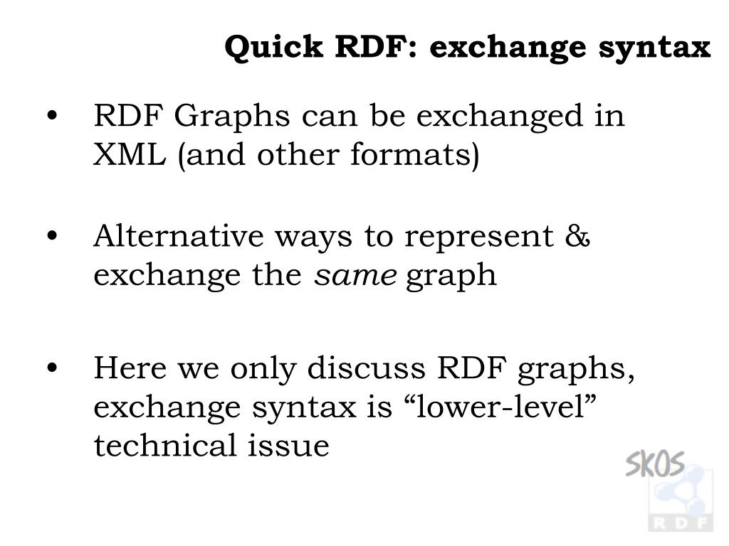 Quick RDF: exchange syntax • RDF Graphs can be exchanged in XML (and other formats) • Alternative ways to represent & exchange the same graph • Here we only discuss RDF graphs, exchange syntax is “lower-level” technical issue