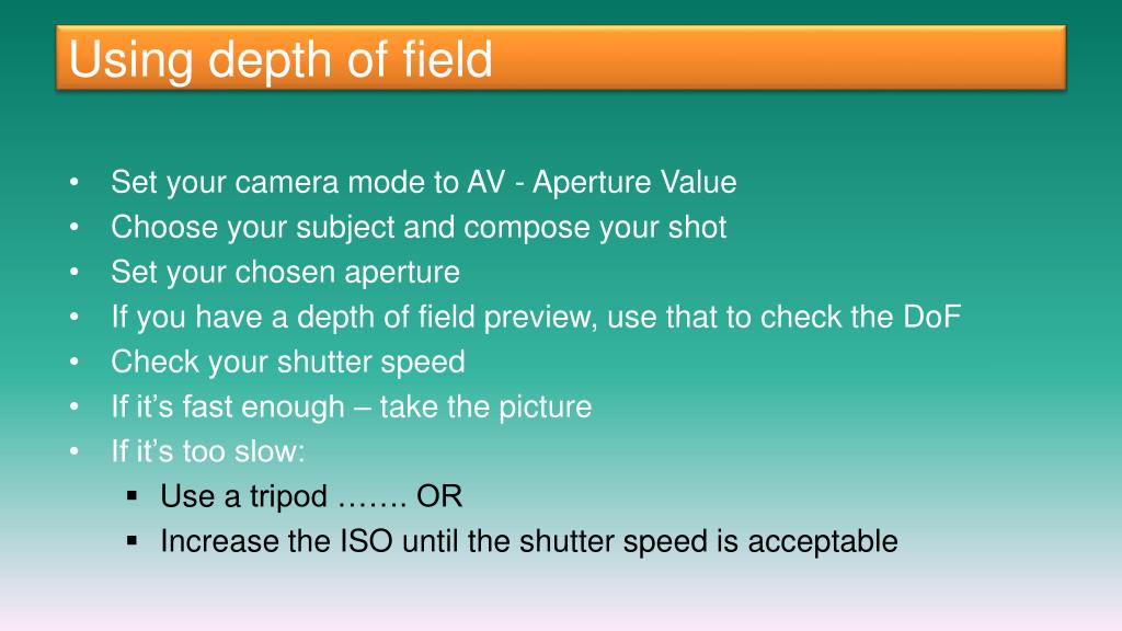 Using depth of field • Set your camera mode to AV - Aperture Value • Choose your subject and compose your shot • Set your chosen aperture • If you have a depth of field preview, use that to check the DoF • Check your shutter speed • If it’s fast enough – take the picture • If it’s too slow: • Use a tripod ……. OR • Increase the ISO until the shutter speed is acceptable