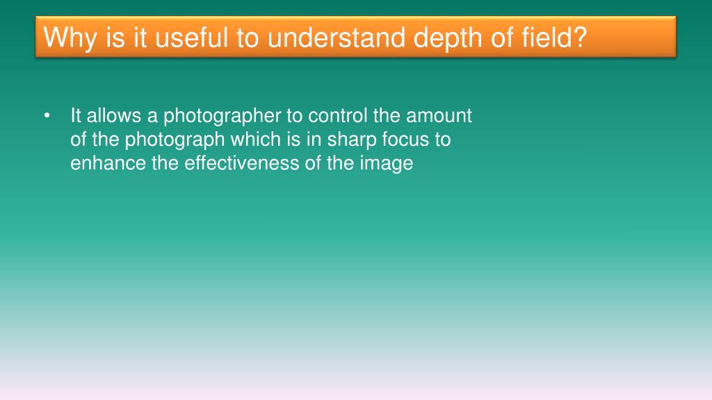 Why is it useful to understand depth of field? • It allows a photographer to control the amountof the photograph which is in sharp focus toenhancethe effectiveness of the image