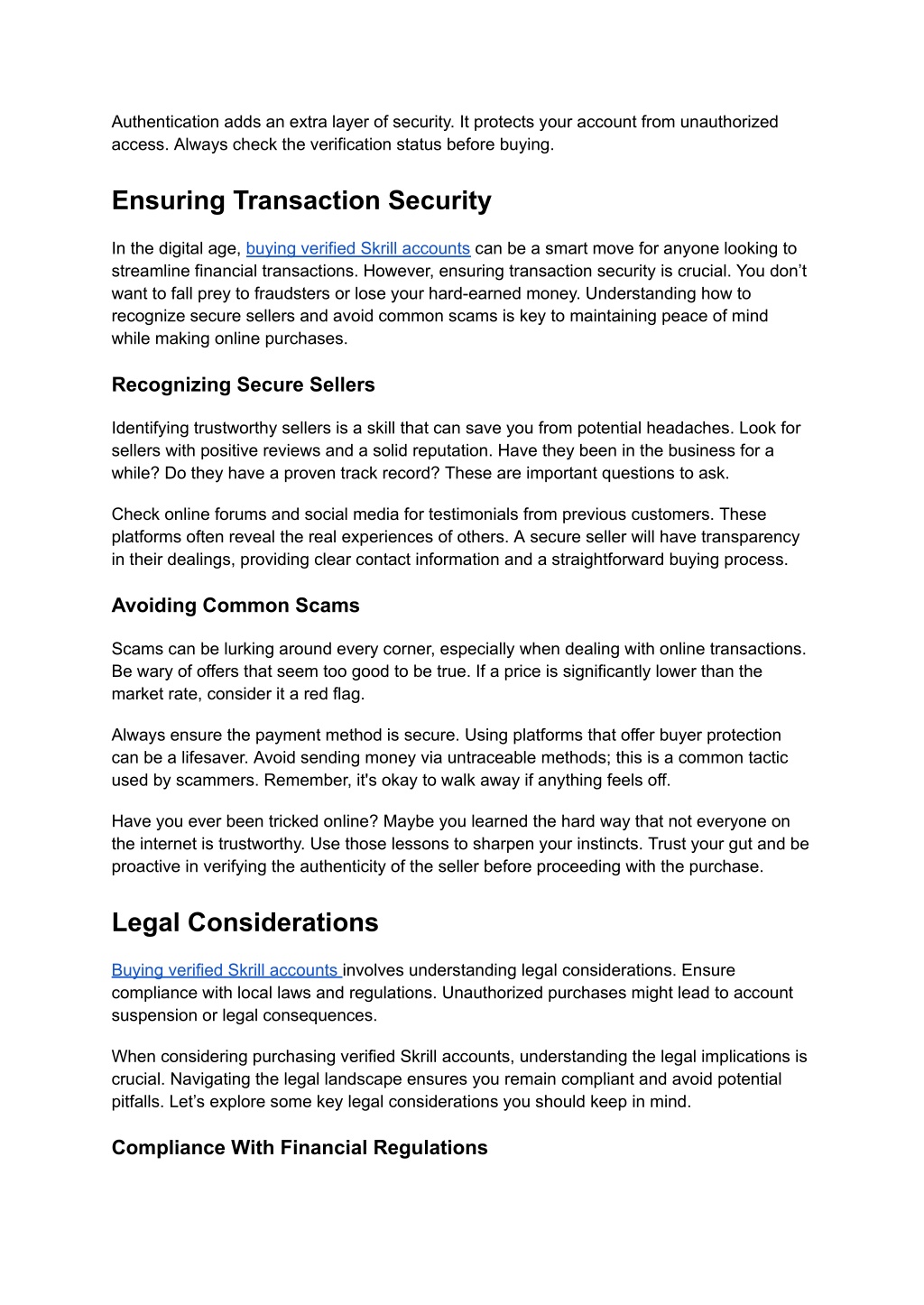 4. Authentication adds an extra layer of security. It protects your account from unauthorized access. Always check the verification status before buying. Ensuring Transaction Security In the digital age, buying verified Skrill accounts can be a smart move for anyone looking to streamline financial transactions. However, ensuring transaction security is crucial. You don’t want to fall prey to fraudsters or lose your hard-earned money. Understanding how to recognize secure sellers and avoid common scams is key to maintaining peace of mind while making online purchases. Recognizing Secure Sellers Identifying trustworthy sellers is a skill that can save you from potential headaches. Look for sellers with positive reviews and a solid reputation. Have they been in the business for a while? Do they have a proven track record? These are important questions to ask. Check online forums and social media for testimonials from previous customers. These platforms often reveal the real experiences of others. A secure seller will have transparency in their dealings, providing clear contact information and a straightforward buying process. Avoiding Common Scams Scams can be lurking around every corner, especially when dealing with online transactions. Be wary of offers that seem too good to be true. If a price is significantly lower than the market rate, consider it a red flag. Always ensure the payment method is secure. Using platforms that offer buyer protection can be a lifesaver. Avoid sending money via untraceable methods; this is a common tactic used by scammers. Remember, it's okay to walk away if anything feels off. Have you ever been tricked online? Maybe you learned the hard way that not everyone on the internet is trustworthy. Use those lessons to sharpen your instincts. Trust your gut and be proactive in verifying the authenticity of the seller before proceeding with the purchase. Legal Considerations Buying verified Skrill accounts involves understanding legal considerations. Ensure compliance with local laws and regulations. Unauthorized purchases might lead to account suspension or legal consequences. When considering purchasing verified Skrill accounts, understanding the legal implications is crucial. Navigating the legal landscape ensures you remain compliant and avoid potential pitfalls. Let’s explore some key legal considerations you should keep in mind. Compliance With Financial Regulations