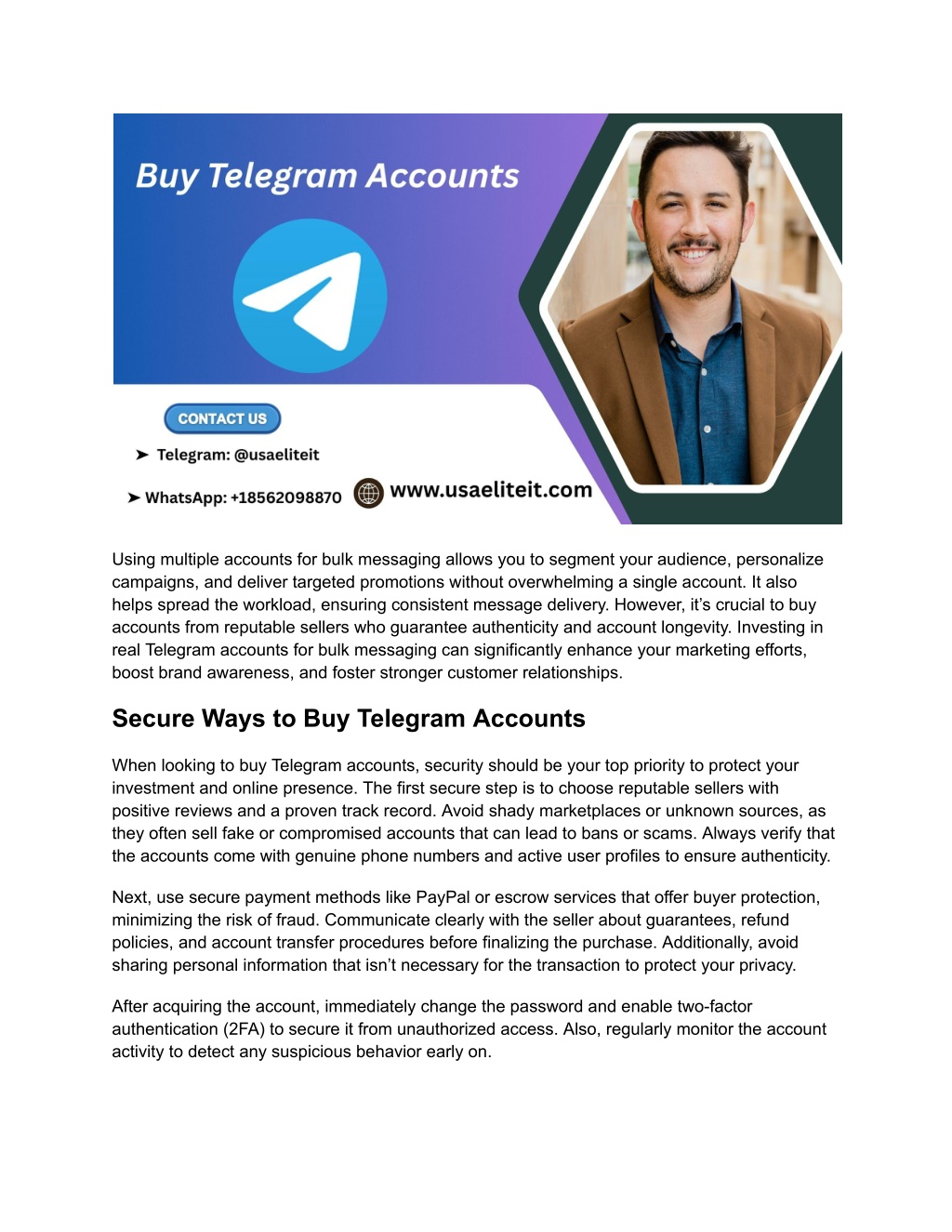 Buy Telegram Accounts with Real Users Buying Telegram accounts with real users ensures authentic engagement and genuine interaction on your channels or groups. These accounts come with verified phone numbers and active profiles, making them ideal for marketing, promotions, or community building. Unlike fake or bot accounts, real-user accounts help increase trust, improve visibility, and enhance credibility on Telegram. When purchasing, always choose reputable sellers who guarantee account authenticity and privacy protection. Real-user accounts also reduce the risk of bans or restrictions, allowing you to grow your audience organically. Invest wisely in genuine Telegram accounts to maximize your social media impact and outreach. Contact us Telegram: @usaeliteit WhatsApp: +18562098870 Buy Telegram Accounts to Boost Your Channel Buying Telegram accounts is an effective strategy to boost your channel’s growth quickly and efficiently. With multiple active accounts, you can increase your channel’s member count, improve engagement rates, and create a more vibrant community. Real and verified Telegram accounts provide genuine interactions, making your channel appear trustworthy and popular. This attracts more organic followers and helps your content reach a wider audience through shares and recommendations. Additionally, having multiple accounts allows you to manage promotions, send targeted messages, and engage with your followers more personally. However, it’s important to buy accounts from reliable sources to avoid fake or banned profiles that could harm your channel’s reputation. By investing in authentic Telegram accounts, you’ll create a strong foundation for your channel’s success, making it easier to grow, monetize, and build a loyal audience over time. Buy Telegram Accounts for Bulk Messaging Buying Telegram accounts for bulk messaging is a powerful way to reach a large audience efficiently. Businesses, marketers, and community managers often need to send messages to thousands of users simultaneously, and using multiple Telegram accounts makes this process smoother and more effective. By purchasing verified and real-user accounts, you ensure that your bulk messages won’t be flagged as spam, increasing the chances of reaching your target audience. These accounts come with unique phone numbers and genuine activity, which helps maintain Telegram’s usage policies and reduces the risk of bans.