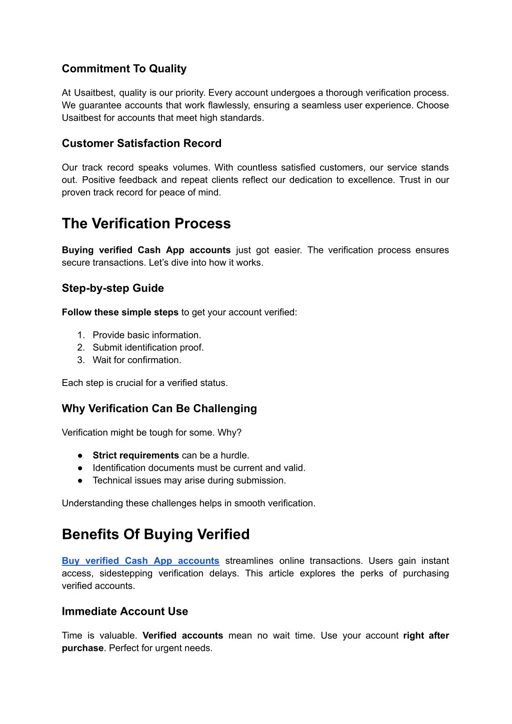 Commitment To Quality At Usaitbest, quality is our priority. Every account undergoes a thorough verification process. We guarantee accounts that work flawlessly, ensuring a seamless user experience. Choose Usaitbest for accounts that meet high standards. Customer Satisfaction Record Our track record speaks volumes. With countless satisfied customers, our service stands out. Positive feedback and repeat clients reflect our dedication to excellence. Trust in our proven track record for peace of mind. The Verification Process Buying verified Cash App accounts just got easier. The verification process ensures secure transactions. Let’s dive into how it works. Step-by-step Guide Follow these simple steps to get your account verified: 1. Provide basic information. 2. Submit identification proof. 3. Wait for confirmation. Each step is crucial for a verified status. Why Verification Can Be Challenging Verification might be tough for some. Why? ● Strict requirements can be a hurdle. ● Identification documents must be current and valid. ● Technical issues may arise during submission. Understanding these challenges helps in smooth verification. Benefits Of Buying Verified Buy verified Cash App accounts streamlines online transactions. Users gain instant access, sidestepping verification delays. This article explores the perks of purchasing verified accounts. Immediate Account Use Time is valuable. Verified accounts mean no wait time. Use your account right after purchase. Perfect for urgent needs.