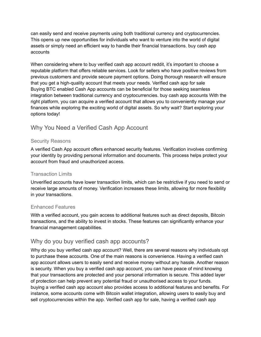 can easily send and receive payments using both traditional currency and cryptocurrencies. This opens up new opportunities for individuals who want to venture into the world of digital assets or simply need an efficient way to handle their financial transactions. buy cash app accounts When considering where to buy verified cash app account reddit, it’s important to choose a reputable platform that offers reliable services. Look for sellers who have positive reviews from previous customers and provide secure payment options. Doing thorough research will ensure that you get a high-quality account that meets your needs. Verified cash app for sale Buying BTC enabled Cash App accounts can be beneficial for those seeking seamless integration between traditional currency and cryptocurrencies. buy cash app accounts With the right platform, you can acquire a verified account that allows you to conveniently manage your finances while exploring the exciting world of digital assets. So why wait? Start exploring your options today! Why You Need a Verified Cash App Account Security Reasons A verified Cash App account offers enhanced security features. Verification involves confirming your identity by providing personal information and documents. This process helps protect your account from fraud and unauthorized access. Transaction Limits Unverified accounts have lower transaction limits, which can be restrictive if you need to send or receive large amounts of money. Verification increases these limits, allowing for more flexibility in your transactions. Enhanced Features With a verified account, you gain access to additional features such as direct deposits, Bitcoin transactions, and the ability to invest in stocks. These features can significantly enhance your financial management capabilities. Why do you buy verified cash app accounts? Why do you buy verified cash app account? Well, there are several reasons why individuals opt to purchase these accounts. One of the main reasons is convenience. Having a verified cash app account allows users to easily send and receive money without any hassle. Another reason is security. When you buy a verified cash app account, you can have peace of mind knowing that your transactions are protected and your personal information is secure. This added layer of protection can help prevent any potential fraud or unauthorised access to your funds. buying a verified cash app account also provides access to additional features and benefits. For instance, some accounts come with Bitcoin wallet integration, allowing users to easily buy and sell cryptocurrencies within the app. Verified cash app for sale, having a verified cash app