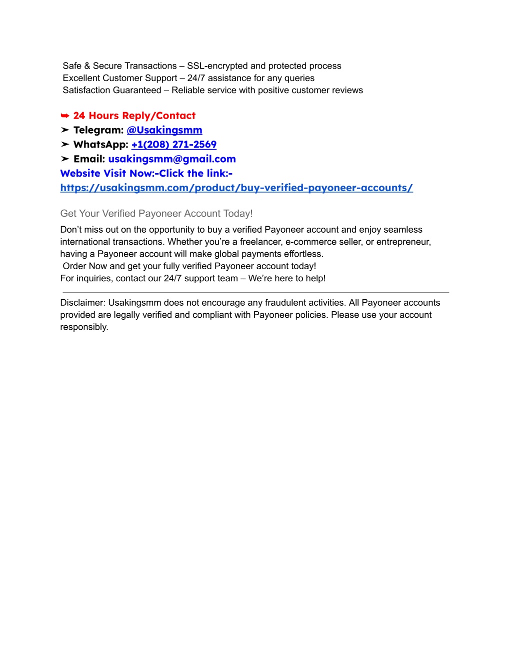 4. Safe & Secure Transactions – SSL-encrypted and protected process Excellent Customer Support – 24/7 assistance for any queries Satisfaction Guaranteed – Reliable service with positive customer reviews ➥ 24 Hours Reply/Contact ➤ Telegram: @Usakingsmm ➤ WhatsApp: +1(208) 271-2569 ➤ Email: usakingsmm@gmail.com Website Visit Now:-Click the link:- https://usakingsmm.com/product/buy-verified-payoneer-accounts/ Get Your Verified Payoneer Account Today! Don’t miss out on the opportunity to buy a verified Payoneer account and enjoy seamless international transactions. Whether you’re a freelancer, e-commerce seller, or entrepreneur, having a Payoneer account will make global payments effortless. Order Now and get your fully verified Payoneer account today! For inquiries, contact our 24/7 support team – We’re here to help! Disclaimer: Usakingsmm does not encourage any fraudulent activities. All Payoneer accounts provided are legally verified and compliant with Payoneer policies. Please use your account responsibly.