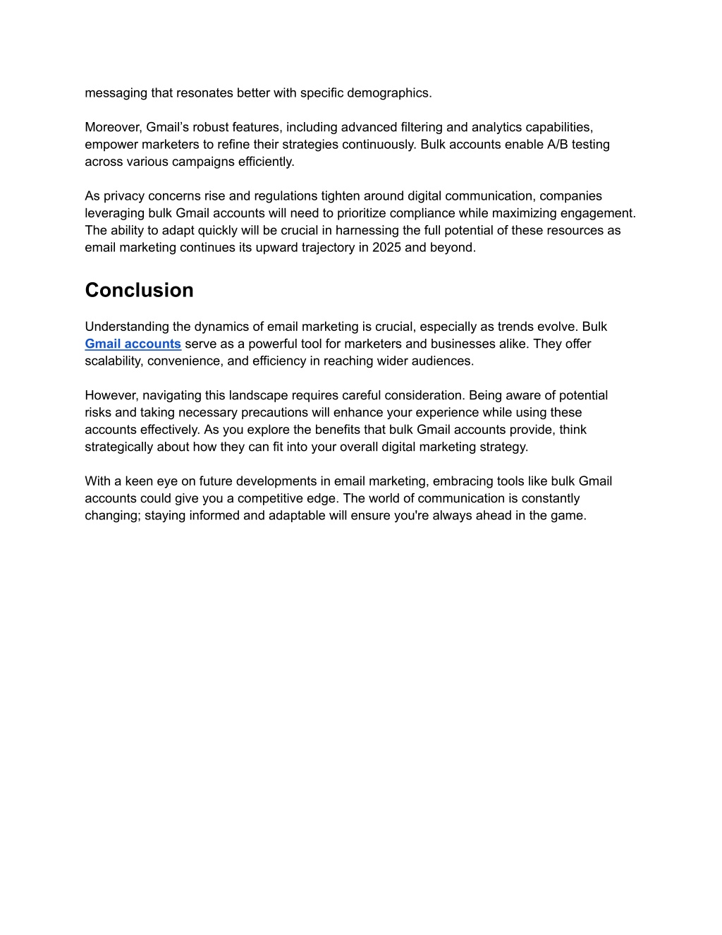 messaging that resonates better with specific demographics. Moreover, Gmail’s robust features, including advanced filtering and analytics capabilities, empower marketers to refine their strategies continuously. Bulk accounts enable A/B testing across various campaigns efficiently. As privacy concerns rise and regulations tighten around digital communication, companies leveraging bulk Gmail accounts will need to prioritize compliance while maximizing engagement. The ability to adapt quickly will be crucial in harnessing the full potential of these resources as email marketing continues its upward trajectory in 2025 and beyond. Conclusion Understanding the dynamics of email marketing is crucial, especially as trends evolve. Bulk Gmail accounts serve as a powerful tool for marketers and businesses alike. They offer scalability, convenience, and efficiency in reaching wider audiences. However, navigating this landscape requires careful consideration. Being aware of potential risks and taking necessary precautions will enhance your experience while using these accounts effectively. As you explore the benefits that bulk Gmail accounts provide, think strategically about how they can fit into your overall digital marketing strategy. With a keen eye on future developments in email marketing, embracing tools like bulk Gmail accounts could give you a competitive edge. The world of communication is constantly changing; staying informed and adaptable will ensure you're always ahead in the game.
