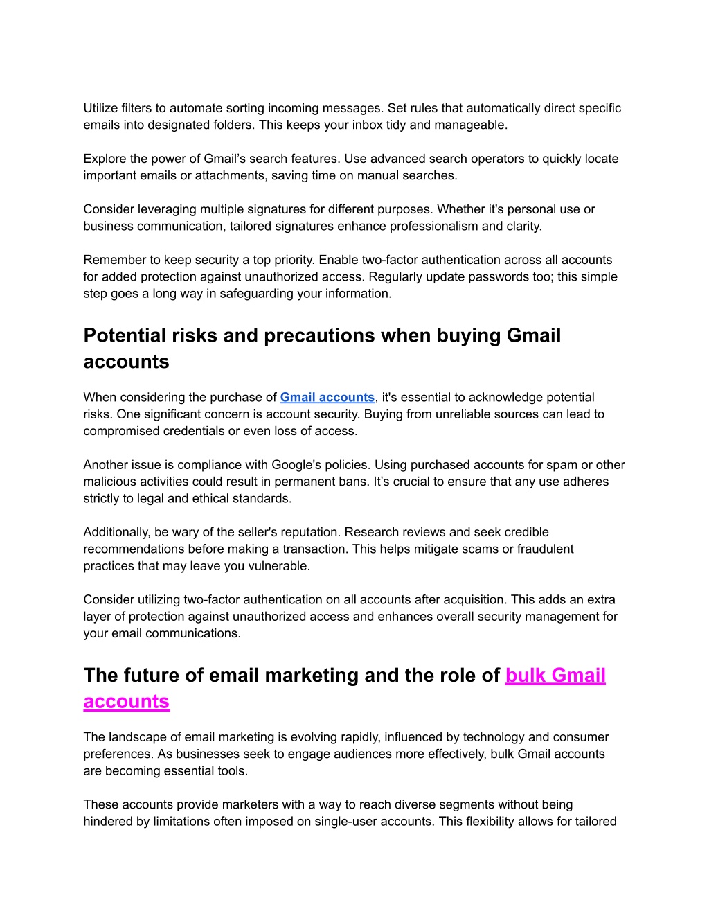 Utilize filters to automate sorting incoming messages. Set rules that automatically direct specific emails into designated folders. This keeps your inbox tidy and manageable. Explore the power of Gmail’s search features. Use advanced search operators to quickly locate important emails or attachments, saving time on manual searches. Consider leveraging multiple signatures for different purposes. Whether it's personal use or business communication, tailored signatures enhance professionalism and clarity. Remember to keep security a top priority. Enable two-factor authentication across all accounts for added protection against unauthorized access. Regularly update passwords too; this simple step goes a long way in safeguarding your information. Potential risks and precautions when buying Gmail accounts When considering the purchase of Gmail accounts, it's essential to acknowledge potential risks. One significant concern is account security. Buying from unreliable sources can lead to compromised credentials or even loss of access. Another issue is compliance with Google's policies. Using purchased accounts for spam or other malicious activities could result in permanent bans. It’s crucial to ensure that any use adheres strictly to legal and ethical standards. Additionally, be wary of the seller's reputation. Research reviews and seek credible recommendations before making a transaction. This helps mitigate scams or fraudulent practices that may leave you vulnerable. Consider utilizing two-factor authentication on all accounts after acquisition. This adds an extra layer of protection against unauthorized access and enhances overall security management for your email communications. The future of email marketing and the role of bulk Gmail accounts The landscape of email marketing is evolving rapidly, influenced by technology and consumer preferences. As businesses seek to engage audiences more effectively, bulk Gmail accounts are becoming essential tools. These accounts provide marketers with a way to reach diverse segments without being hindered by limitations often imposed on single-user accounts. This flexibility allows for tailored