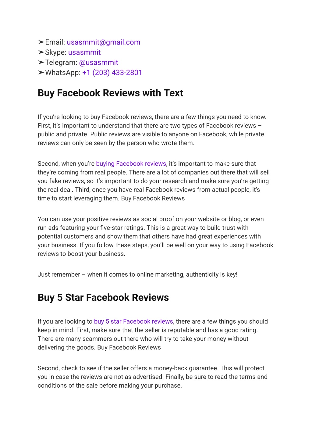 4. By following these simple tips, you can be sure to get exactly what you paid for when buying 5-star Facebook reviews. Buy Bad Facebook Reviews Have you ever seen a Facebook page with tons of five-star reviews and wondered how they got so many? Or have you come across a page with nothing but one-star reviews and thought to yourself, “What did they do to deserve that?” We’ve all been there. Buy Facebook Reviews And in today’s age of social media, businesses are increasingly turning to paid services to boost their online presence – including buying fake reviews on Facebook. That’s right – there are companies out there whose entire business model is based on creating fake positive or negative reviews for businesses on Facebook (and other platforms). And while it may seem like a quick and easy way to improve your business’s online reputation, there are actually quite a few risks associated with this practice. Buy Facebook Reviews For starters, it’s important to remember that Facebook is constantly monitoring activity on its platform – including review activity. So if they catch wind of the fact that you’re paying for fake reviews, they could penalize your Page by reducing your reach or even removing your Page entirely. Additionally, any customers who figure out that you’re behind the bogus reviews are likely to be turned off by the deception and take their business elsewhere. In other words, buying fake reviews could end up doing more harm than good for your business. For More Information Contact Us : ➤Email: usasmmit@gmail.com ➤Skype: usasmmit ➤Telegram: @usasmmit ➤WhatsApp: +1 (203) 433-2801 Get Facebook Reviews