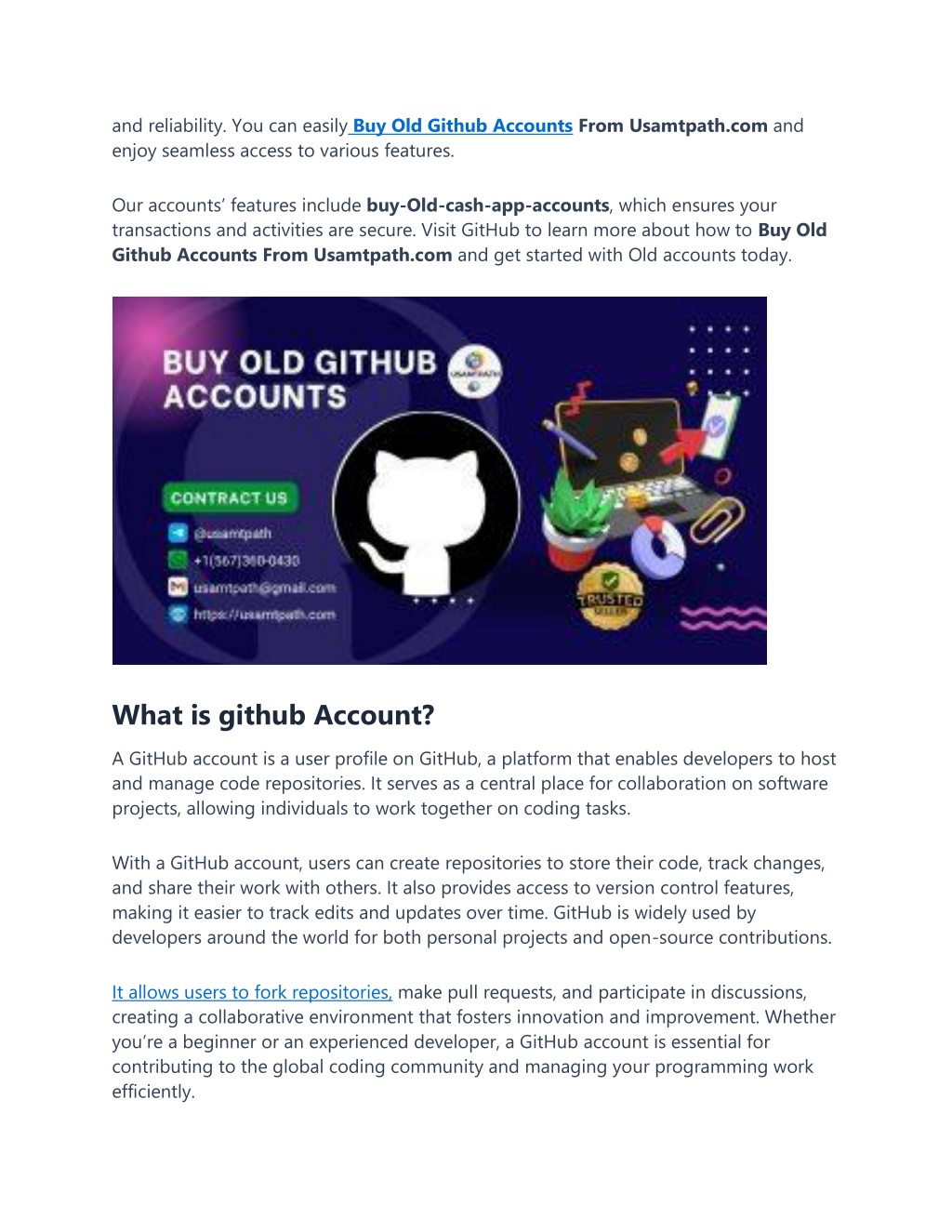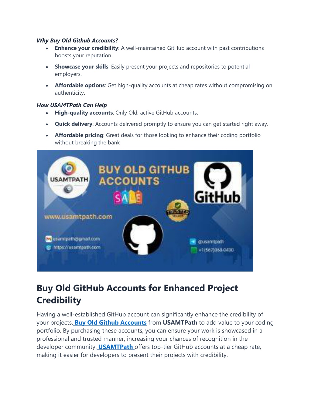 10. Why Should You Buy Old Github Accounts?  Increased trustworthiness: A Old account instantly makes your projects more credible. Better visibility: Stand out to potential employers or clients looking for established developers.  Boost your professional profile: Enhance your reputation by showcasing past contributions.  Key Benefits of Choosing USAMTPath:  High-quality accounts: Only Old, aged GitHub accounts are available. Affordable pricing: Get the best deals on Old GitHub accounts at a cheap rate.  Quick and reliable service: Accounts are delivered promptly to ensure your projects are live as soon as possible.  When you Buy Old Github Accounts, you gain an edge in the competitive coding industry. Trust USAMTPath to provide you with the best quality accounts that elevate your project credibility and enhance your developer profile. Buy Old GitHub Accounts to Access Established Repositories When you need to access established repositories and build a robust coding portfolio, Buy Old Github Accounts from USAMTPath. These old, Old accounts come with a rich history of contributions, offering you immediate access to high-quality repositories. Whether you’re looking to contribute to popular projects or showcase your work, Buy Old Github Accounts to quickly establish your presence on the platform. Why Buy Old Github Accounts for Established Repositories?  Instant access to trusted projects: Dive into top-tier repositories without starting from scratch. Enhance your profile’s credibility: Having an account with a history of contributions improves your standing in the developer community.  Speed up your development process: Get straight to the code and repositories that matter.  Why Choose USAMTPath for Your GitHub Accounts?  High-quality accounts: All accounts are Old and come with established repositories. Affordable prices: USAMTPath offers cheap rates on high-quality GitHub accounts. 