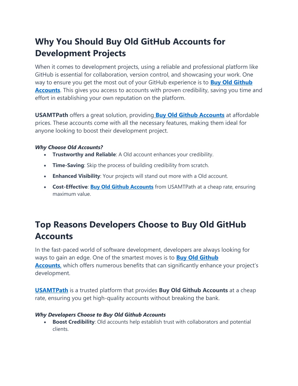7. Why You Should Buy Old GitHub Accounts for Development Projects When it comes to development projects, using a reliable and professional platform like GitHub is essential for collaboration, version control, and showcasing your work. One way to ensure you get the most out of your GitHub experience is to Buy Old Github Accounts. This gives you access to accounts with proven credibility, saving you time and effort in establishing your own reputation on the platform. USAMTPath offers a great solution, providing Buy Old Github Accounts at affordable prices. These accounts come with all the necessary features, making them ideal for anyone looking to boost their development project. Why Choose Old Accounts?  Trustworthy and Reliable: A Old account enhances your credibility. Time-Saving: Skip the process of building credibility from scratch.  Enhanced Visibility: Your projects will stand out more with a Old account.  Cost-Effective: Buy Old Github Accounts from USAMTPath at a cheap rate, ensuring maximum value.  Top Reasons Developers Choose to Buy Old GitHub Accounts In the fast-paced world of software development, developers are always looking for ways to gain an edge. One of the smartest moves is to Buy Old Github Accounts, which offers numerous benefits that can significantly enhance your project’s development. USAMTPath is a trusted platform that provides Buy Old Github Accounts at a cheap rate, ensuring you get high-quality accounts without breaking the bank. Why Developers Choose to Buy Old Github Accounts  Boost Credibility: Old accounts help establish trust with collaborators and potential clients.