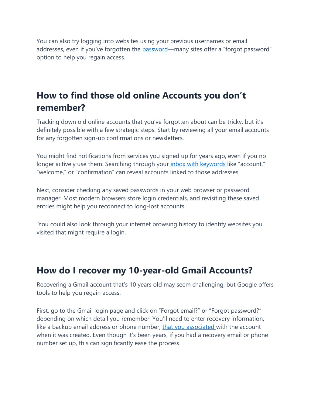 You can also try logging into websites using your previous usernames or email addresses, even if you’ve forgotten the password—many sites offer a ―forgot password‖ option to help you regain access. How to find those old online Accounts you don’t remember? Tracking down old online accounts that you’ve forgotten about can be tricky, but it’s definitely possible with a few strategic steps. Start by reviewing all your email accounts for any forgotten sign-up confirmations or newsletters. You might find notifications from services you signed up for years ago, even if you no longer actively use them. Searching through your inbox with keywords like ―account,‖ ―welcome,‖ or ―confirmation‖ can reveal accounts linked to those addresses. Next, consider checking any saved passwords in your web browser or password manager. Most modern browsers store login credentials, and revisiting these saved entries might help you reconnect to long-lost accounts. You could also look through your internet browsing history to identify websites you visited that might require a login. How do I recover my 10-year-old Gmail Accounts? Recovering a Gmail account that’s 10 years old may seem challenging, but Google offers tools to help you regain access. First, go to the Gmail login page and click on ―Forgot email?‖ or ―Forgot password?‖ depending on which detail you remember. You’ll need to enter recovery information, like a backup email address or phone number, that you associated with the account when it was created. Even though it’s been years, if you had a recovery email or phone number set up, this can significantly ease the process.