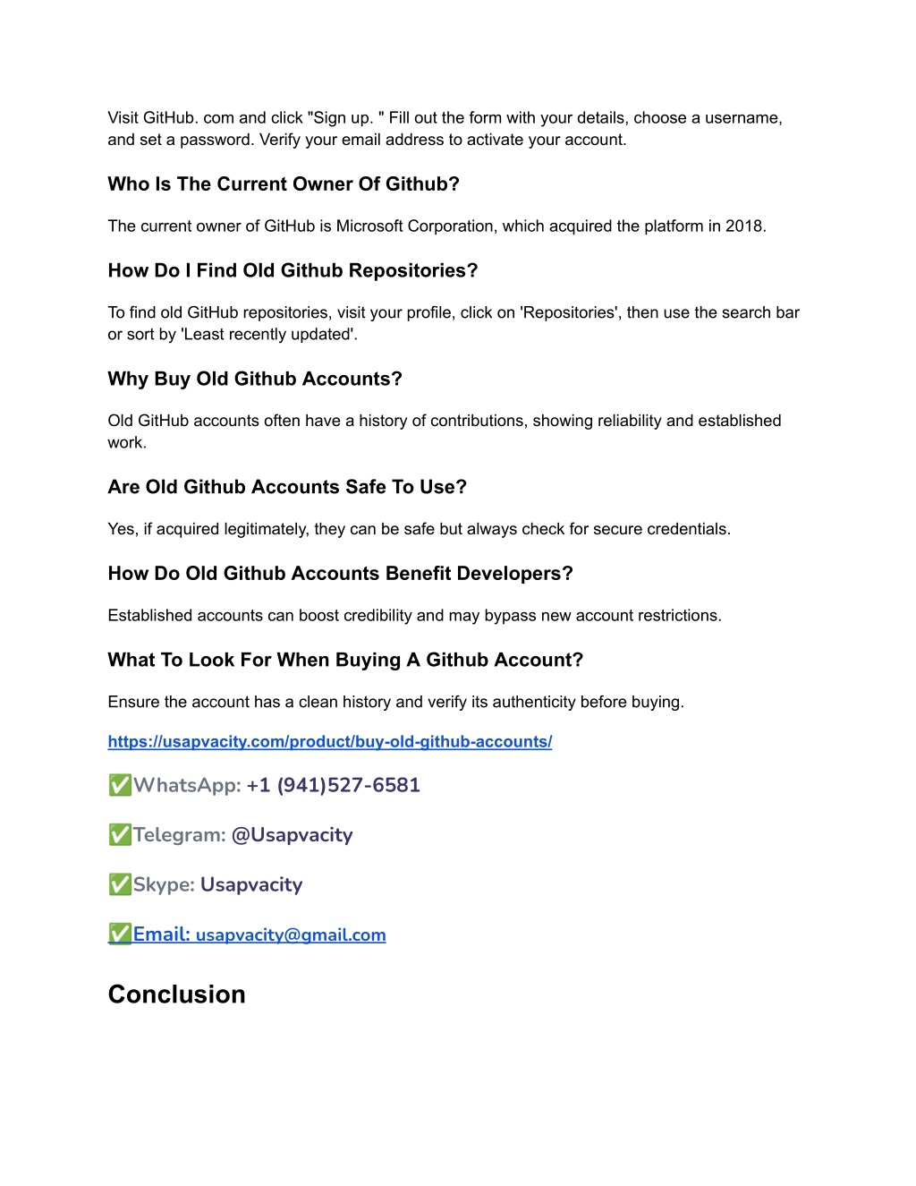 Visit GitHub. com and click "Sign up. " Fill out the form with your details, choose a username, and set a password. Verify your email address to activate your account. Who Is The Current Owner Of Github? The current owner of GitHub is Microsoft Corporation, which acquired the platform in 2018. How Do I Find Old Github Repositories? To find old GitHub repositories, visit your profile, click on 'Repositories', then use the search bar or sort by 'Least recently updated'. Why Buy Old Github Accounts? Old GitHub accounts often have a history of contributions, showing reliability and established work. Are Old Github Accounts Safe To Use? Yes, if acquired legitimately, they can be safe but always check for secure credentials. How Do Old Github Accounts Benefit Developers? Established accounts can boost credibility and may bypass new account restrictions. What To Look For When Buying A Github Account? Ensure the account has a clean history and verify its authenticity before buying. https://usapvacity.com/product/buy-old-github-accounts/ ✅WhatsApp: +1 (941)527-6581 ✅Telegram: @Usapvacity ✅Skype: Usapvacity ✅Email: usapvacity@gmail.com Conclusion