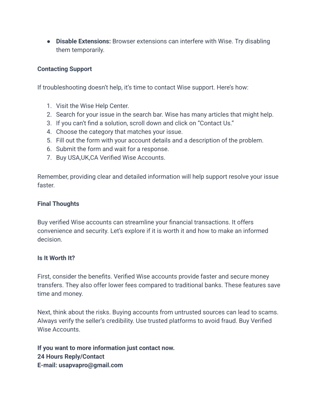 ● Disable Extensions: Browser extensions can interfere with Wise. Try disabling them temporarily. Contacting Support If troubleshooting doesn’t help, it’s time to contact Wise support. Here’s how: 1. Visit the Wise Help Center. 2. Search for your issue in the search bar. Wise has many articles that might help. 3. If you can’t find a solution, scroll down and click on “Contact Us.” 4. Choose the category that matches your issue. 5. Fill out the form with your account details and a description of the problem. 6. Submit the form and wait for a response. 7. Buy USA,UK,CA Verified Wise Accounts. Remember, providing clear and detailed information will help support resolve your issue faster. Final Thoughts Buy verified Wise accounts can streamline your financial transactions. It offers convenience and security. Let’s explore if it is worth it and how to make an informed decision. Is It Worth It? First, consider the benefits. Verified Wise accounts provide faster and secure money transfers. They also offer lower fees compared to traditional banks. These features save time and money. Next, think about the risks. Buying accounts from untrusted sources can lead to scams. Always verify the seller’s credibility. Use trusted platforms to avoid fraud. Buy Verified Wise Accounts. If you want to more information just contact now. 24 Hours Reply/Contact E-mail: usapvapro@gmail.com