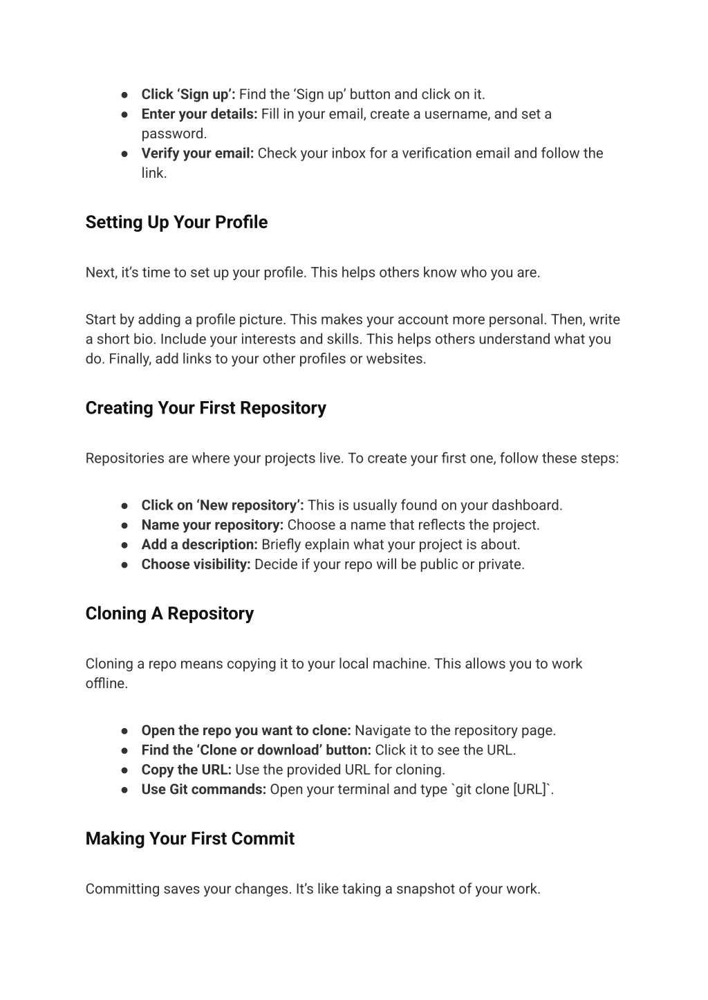 ● Click ‘Sign up’: Find the ‘Sign up’ button and click on it. ● Enter your details: Fill in your email, create a username, and set a password. ● Verify your email: Check your inbox for a verification email and follow the link. Setting Up Your Profile Next, it’s time to set up your profile. This helps others know who you are. Start by adding a profile picture. This makes your account more personal. Then, write a short bio. Include your interests and skills. This helps others understand what you do. Finally, add links to your other profiles or websites. Creating Your First Repository Repositories are where your projects live. To create your first one, follow these steps: ● Click on ‘New repository’: This is usually found on your dashboard. ● Name your repository: Choose a name that reflects the project. ● Add a description: Briefly explain what your project is about. ● Choose visibility: Decide if your repo will be public or private. Cloning A Repository Cloning a repo means copying it to your local machine. This allows you to work offline. ● Open the repo you want to clone: Navigate to the repository page. ● Find the ‘Clone or download’ button: Click it to see the URL. ● Copy the URL: Use the provided URL for cloning. ● Use Git commands: Open your terminal and type `git clone [URL]`. Making Your First Commit Committing saves your changes. It’s like taking a snapshot of your work.