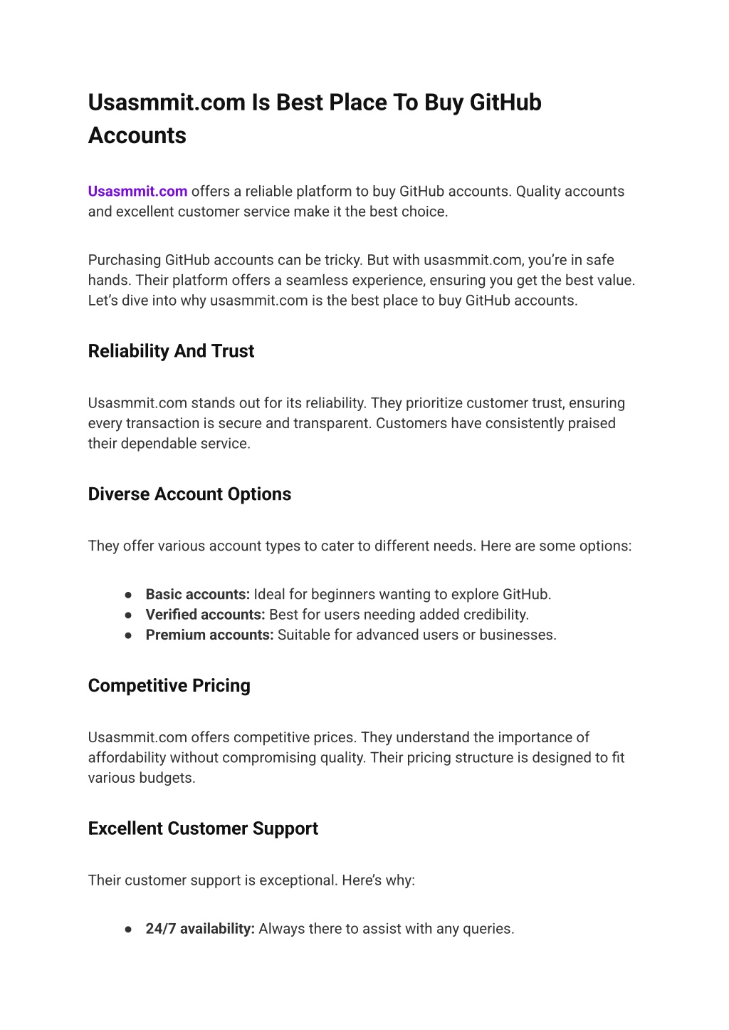 Usasmmit.com Is Best Place To Buy GitHub Accounts Usasmmit.comoffers a reliable platform to buy GitHub accounts. Quality accounts and excellent customer service make it the best choice. Purchasing GitHub accounts can be tricky. But with usasmmit.com, you’re in safe hands. Their platform offers a seamless experience, ensuring you get the best value. Let’s dive into why usasmmit.com is the best place to buy GitHub accounts. Reliability And Trust Usasmmit.com stands out for its reliability. They prioritize customer trust, ensuring every transaction is secure and transparent. Customers have consistently praised their dependable service. Diverse Account Options They offer various account types to cater to different needs. Here are some options: ● Basic accounts: Ideal for beginners wanting to explore GitHub. ● Verified accounts: Best for users needing added credibility. ● Premium accounts: Suitable for advanced users or businesses. Competitive Pricing Usasmmit.com offers competitive prices. They understand the importance of affordability without compromising quality. Their pricing structure is designed to fit various budgets. Excellent Customer Support Their customer support is exceptional. Here’s why: ● 24/7 availability: Always there to assist with any queries.