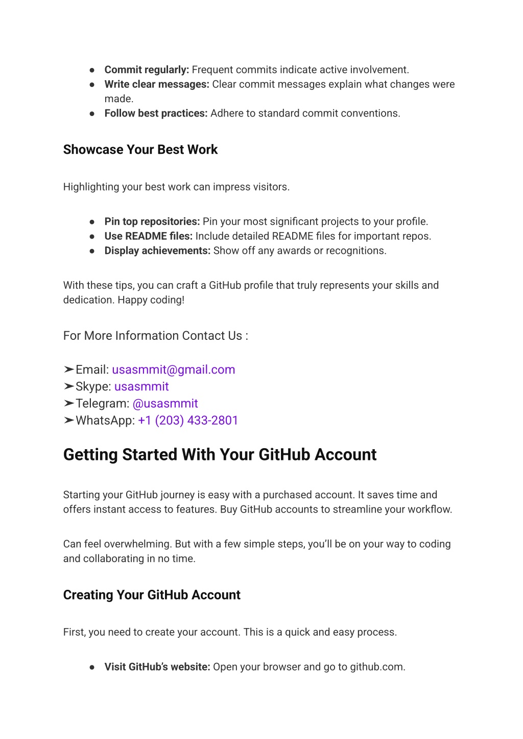 ● Commit regularly: Frequent commits indicate active involvement. ● Write clear messages: Clear commit messages explain what changes were made. ● Follow best practices: Adhere to standard commit conventions. Showcase Your Best Work Highlighting your best work can impress visitors. ● Pin top repositories: Pin your most significant projects to your profile. ● Use README files: Include detailed README files for important repos. ● Display achievements: Show off any awards or recognitions. With these tips, you can craft a GitHub profile that truly represents your skills and dedication. Happy coding! For More Information Contact Us : ➤Email: usasmmit@gmail.com ➤Skype: usasmmit ➤Telegram: @usasmmit ➤WhatsApp: +1 (203) 433-2801 Getting Started With Your GitHub Account Starting your GitHub journey is easy with a purchased account. It saves time and offers instant access to features. Buy GitHub accounts to streamline your workflow. Can feel overwhelming. But with a few simple steps, you’ll be on your way to coding and collaborating in no time. Creating Your GitHub Account First, you need to create your account. This is a quick and easy process. ● Visit GitHub’s website: Open your browser and go to github.com.