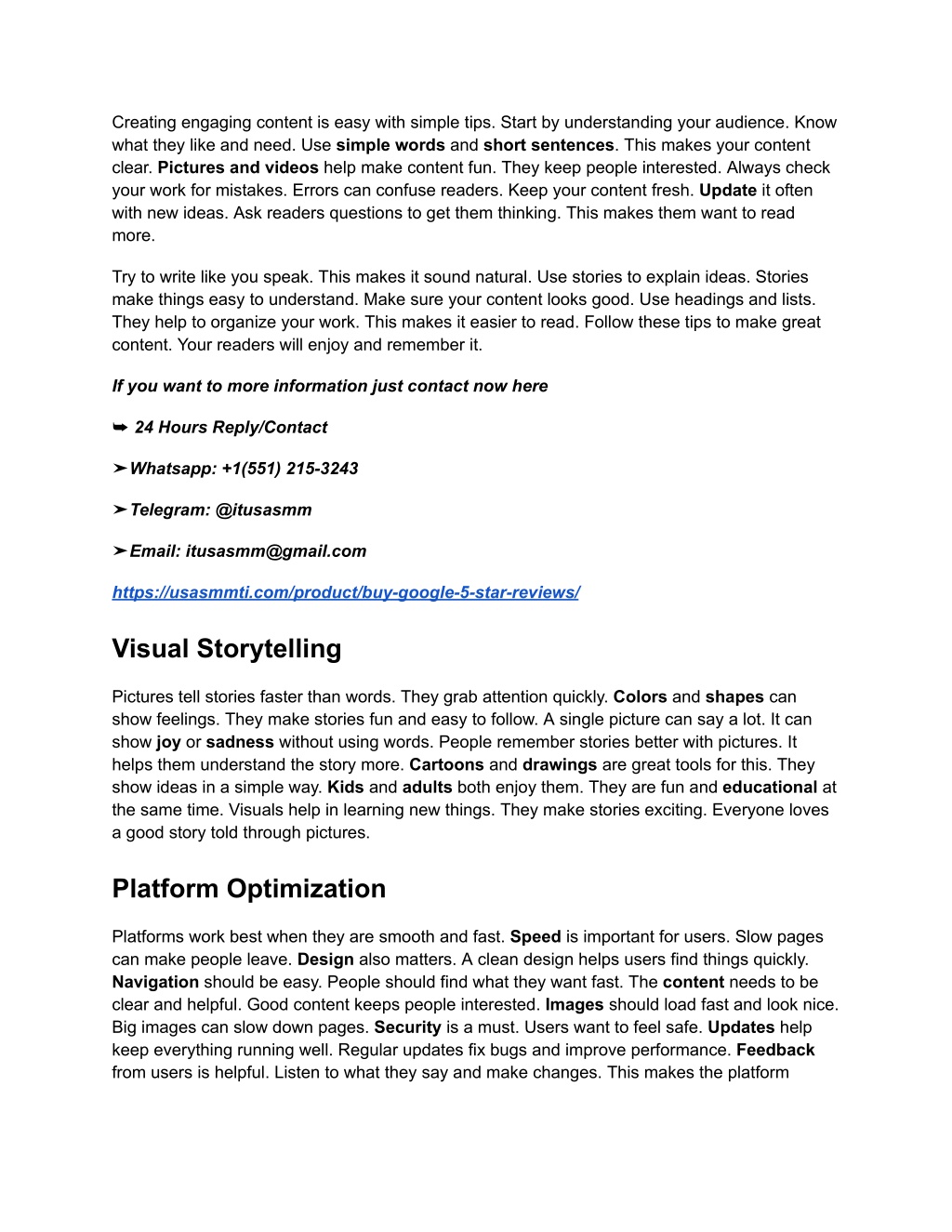 Creating engaging content is easy with simple tips. Start by understanding your audience. Know what they like and need. Use simple words and short sentences. This makes your content clear. Pictures and videos help make content fun. They keep people interested. Always check your work for mistakes. Errors can confuse readers. Keep your content fresh. Update it often with new ideas. Ask readers questions to get them thinking. This makes them want to read more. Try to write like you speak. This makes it sound natural. Use stories to explain ideas. Stories make things easy to understand. Make sure your content looks good. Use headings and lists. They help to organize your work. This makes it easier to read. Follow these tips to make great content. Your readers will enjoy and remember it. If you want to more information just contact now here ➥ 24 Hours Reply/Contact ➤Whatsapp: +1(551) 215-3243 ➤Telegram: @itusasmm ➤Email: itusasmm@gmail.com https://usasmmti.com/product/buy-google-5-star-reviews/ Visual Storytelling Pictures tell stories faster than words. They grab attention quickly. Colors and shapes can show feelings. They make stories fun and easy to follow. A single picture can say a lot. It can show joy or sadness without using words. People remember stories better with pictures. It helps them understand the story more. Cartoons and drawings are great tools for this. They show ideas in a simple way. Kids and adults both enjoy them. They are fun and educational at the same time. Visuals help in learning new things. They make stories exciting. Everyone loves a good story told through pictures. Platform Optimization Platforms work best when they are smooth and fast. Speed is important for users. Slow pages can make people leave. Design also matters. A clean design helps users find things quickly. Navigation should be easy. People should find what they want fast. The content needs to be clear and helpful. Good content keeps people interested. Images should load fast and look nice. Big images can slow down pages. Security is a must. Users want to feel safe. Updates help keep everything running well. Regular updates fix bugs and improve performance. Feedback from users is helpful. Listen to what they say and make changes. This makes the platform