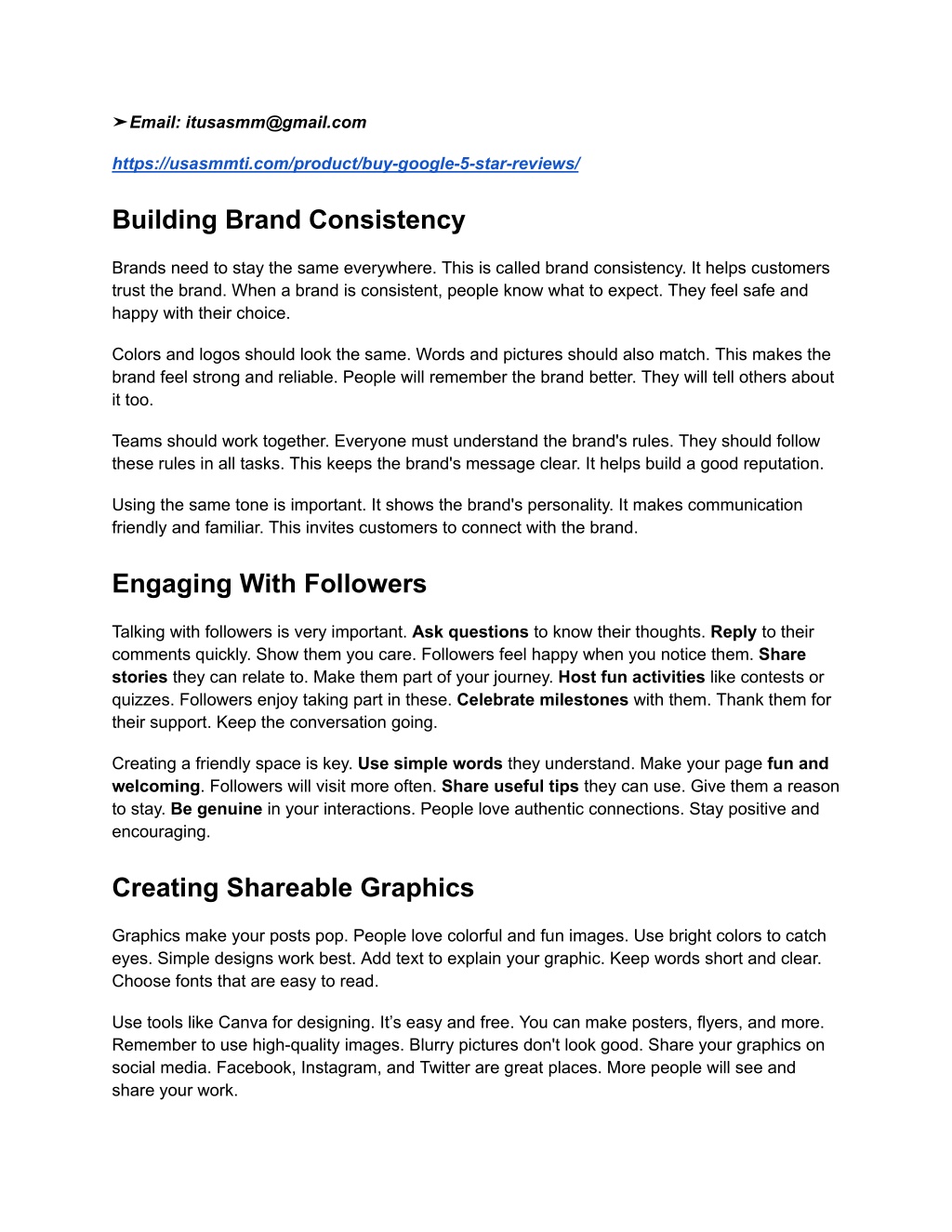 ➤Email: itusasmm@gmail.com https://usasmmti.com/product/buy-google-5-star-reviews/ Building Brand Consistency Brands need to stay the same everywhere. This is called brand consistency. It helps customers trust the brand. When a brand is consistent, people know what to expect. They feel safe and happy with their choice. Colors and logos should look the same. Words and pictures should also match. This makes the brand feel strong and reliable. People will remember the brand better. They will tell others about it too. Teams should work together. Everyone must understand the brand's rules. They should follow these rules in all tasks. This keeps the brand's message clear. It helps build a good reputation. Using the same tone is important. It shows the brand's personality. It makes communication friendly and familiar. This invites customers to connect with the brand. Engaging With Followers Talking with followers is very important. Ask questions to know their thoughts. Reply to their comments quickly. Show them you care. Followers feel happy when you notice them. Share stories they can relate to. Make them part of your journey. Host fun activities like contests or quizzes. Followers enjoy taking part in these. Celebrate milestones with them. Thank them for their support. Keep the conversation going. Creating a friendly space is key. Use simple words they understand. Make your page fun and welcoming. Followers will visit more often. Share useful tips they can use. Give them a reason to stay. Be genuine in your interactions. People love authentic connections. Stay positive and encouraging. Creating Shareable Graphics Graphics make your posts pop. People love colorful and fun images. Use bright colors to catch eyes. Simple designs work best. Add text to explain your graphic. Keep words short and clear. Choose fonts that are easy to read. Use tools like Canva for designing. It’s easy and free. You can make posters, flyers, and more. Remember to use high-quality images. Blurry pictures don't look good. Share your graphics on social media. Facebook, Instagram, and Twitter are great places. More people will see and share your work.