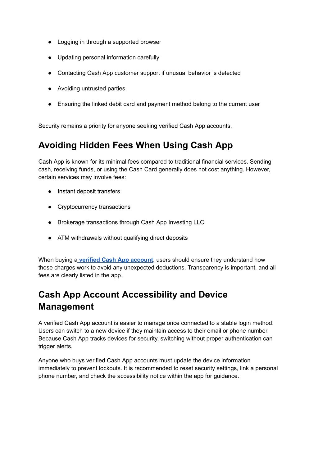● Logging in through a supported browser ● Updating personal information carefully ● Contacting Cash App customer support if unusual behavior is detected ● Avoiding untrusted parties ● Ensuring the linked debit card and payment method belong to the current user Security remains a priority for anyone seeking verified Cash App accounts. Avoiding Hidden Fees When Using Cash App Cash App is known for its minimal fees compared to traditional financial services. Sending cash, receiving funds, or using the Cash Card generally does not cost anything. However, certain services may involve fees: ● Instant deposit transfers ● Cryptocurrency transactions ● Brokerage transactions through Cash App Investing LLC ● ATM withdrawals without qualifying direct deposits When buying a verified Cash App account, users should ensure they understand how these charges work to avoid any unexpected deductions. Transparency is important, and all fees are clearly listed in the app. Cash App Account Accessibility and Device Management A verified Cash App account is easier to manage once connected to a stable login method. Users can switch to a new device if they maintain access to their email or phone number. Because Cash App tracks devices for security, switching without proper authentication can trigger alerts. Anyone who buys verified Cash App accounts must update the device information immediately to prevent lockouts. It is recommended to reset security settings, link a personal phone number, and check the accessibility notice within the app for guidance.