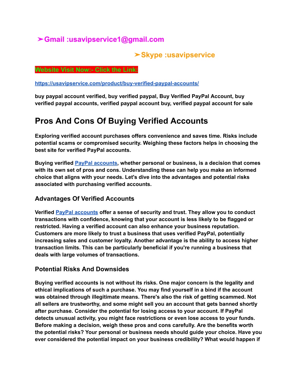 ➤Gmail :usavipservice1@gmail.com ➤Skype :usavipservice Website Visit Now:- Click the Link: https://usavipservice.com/product/buy-verified-paypal-accounts/ buy paypal account verified, buy verified paypal, Buy Verified PayPal Account, buy verified paypal accounts, verified paypal account buy, verified paypal account for sale Pros And Cons Of Buying Verified Accounts Exploring verified account purchases offers convenience and saves time. Risks include potential scams or compromised security. Weighing these factors helps in choosing the best site for verified PayPal accounts. Buying verified PayPal accounts, whether personal or business, is a decision that comes with its own set of pros and cons. Understanding these can help you make an informed choice that aligns with your needs. Let's dive into the advantages and potential risks associated with purchasing verified accounts. Advantages Of Verified Accounts Verified PayPal accounts offer a sense of security and trust. They allow you to conduct transactions with confidence, knowing that your account is less likely to be flagged or restricted. Having a verified account can also enhance your business reputation. Customers are more likely to trust a business that uses verified PayPal, potentially increasing sales and customer loyalty. Another advantage is the ability to access higher transaction limits. This can be particularly beneficial if you're running a business that deals with large volumes of transactions. Potential Risks And Downsides Buying verified accounts is not without its risks. One major concern is the legality and ethical implications of such a purchase. You may find yourself in a bind if the account was obtained through illegitimate means. There's also the risk of getting scammed. Not all sellers are trustworthy, and some might sell you an account that gets banned shortly after purchase. Consider the potential for losing access to your account. If PayPal detects unusual activity, you might face restrictions or even lose access to your funds. Before making a decision, weigh these pros and cons carefully. Are the benefits worth the potential risks? Your personal or business needs should guide your choice. Have you ever considered the potential impact on your business credibility? What would happen if