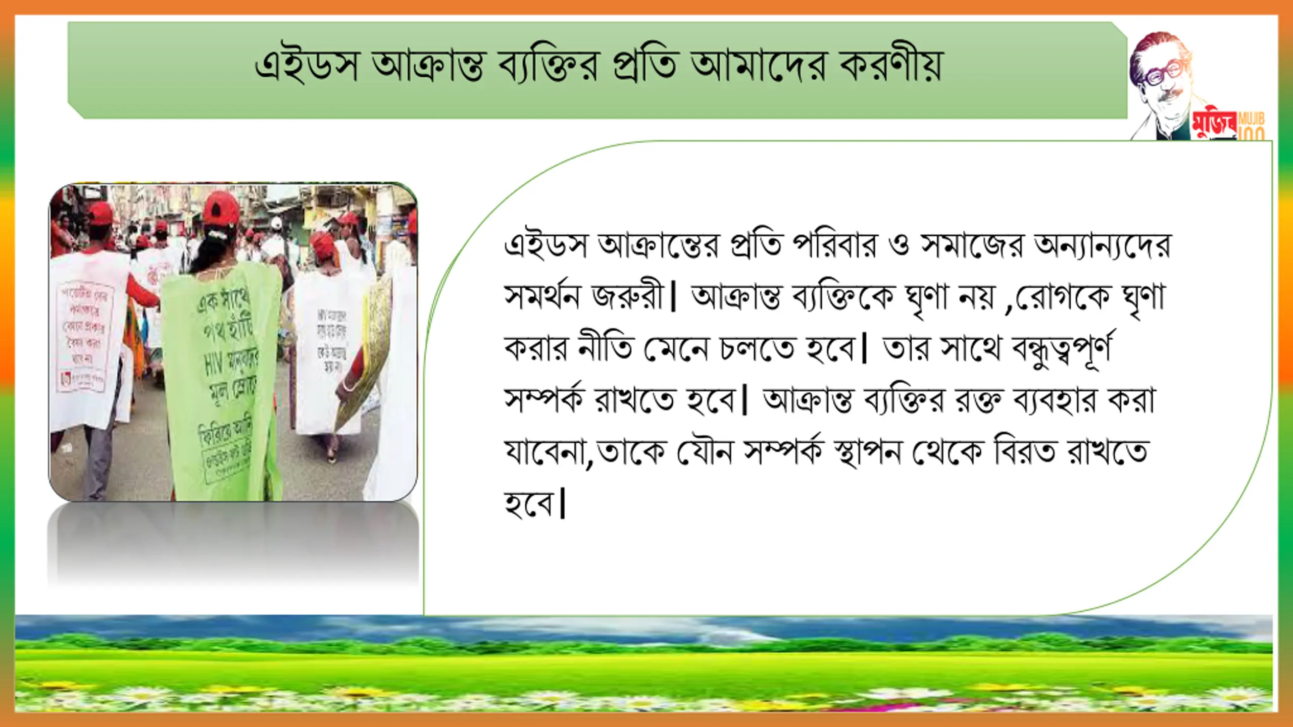 এইডে আক্রান্ত বযছির প্রছত আমাকের ের ীয় এইডে আক্রাকন্তর প্রছত পছরবার ও েমাকজর অনযানযকের েমর্থগন জরুরী। আক্রান্ত বযছিকে ঘৃ া নয় ,শ্ররাগকে ঘৃ া েরার নীছত শ্রমকন চলকত হকব। তার োকর্থ বন্নুত্বপূ গ এইডে আক্রান্ত বযছির জনয োমাছজে ও মানছেে েমর্থগকনর পািাপাছি প্রকয়াজনীয় ছচছেৎো জরুরী। আক্রাকন্তর জ্বর ,ডায়ছরয়া এবাঃ বযর্থা র্থােকল স্বাস্দযকেকে ছনকত হকব। র্াকবনা,তাকে শ্রর্ৌন েম্পেগ স্দাপন শ্রর্থকে ছবরত রাখকত হকব। ছনয়ছমত পুছষ্টের খাবার ও পর্গাপ্ত ছবোকমর বযবস্দা েরকত হকব। েম্পেগ রাখকত হকব। আক্রান্ত বযছির রি বযবহার েরা