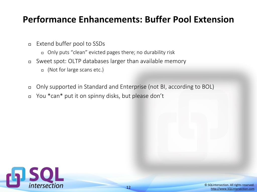 Performance Enhancements: Buffer Pool Extension • Extend buffer pool to SSDs • Only puts “clean” evicted pages there; no durability risk • Sweet spot: OLTP databases larger than available memory • (Not for large scans etc.) • Only supported in Standard and Enterprise (not BI, according to BOL) • You *can* put it on spinny disks, but please don’t