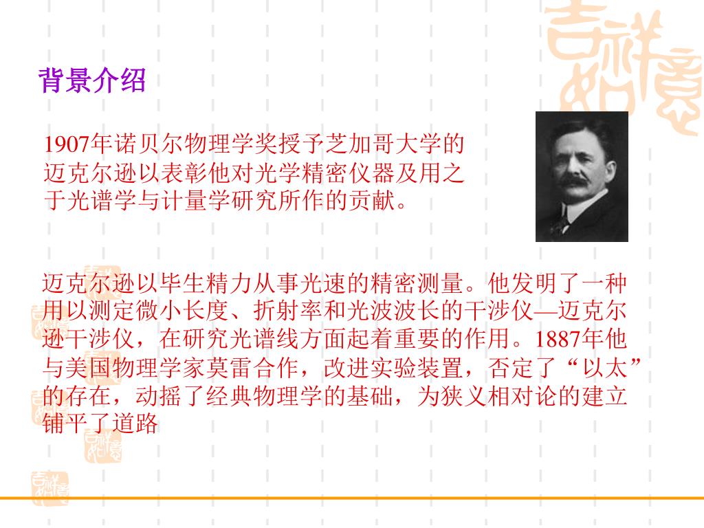 背景介绍 1907年诺贝尔物理学奖授予芝加哥大学的迈克尔逊以表彰他对光学精密仪器及用之于光谱学与计量学研究所作的贡献。 迈克尔逊以毕生精力从事光速的精密测量。他发明了一种用以测定微小长度、折射率和光波波长的干涉仪—迈克尔逊干涉仪,在研究光谱线方面起着重要的作用。1887年他与美国物理学家莫雷合作,改进实验装置,否定了“以太”的存在,动摇了经典物理学的基础,为狭义相对论的建立铺平了道路