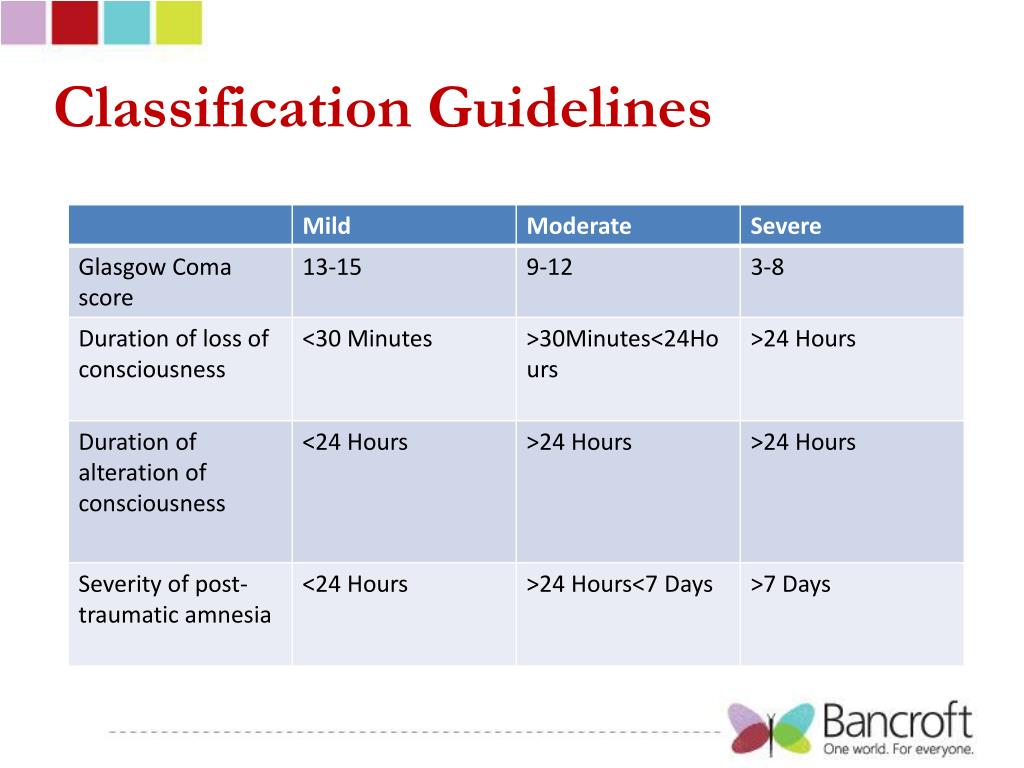 Classification of TBIs Traumatic brain injuries are classified by severity into one of three categories: mild, moderate, or severe. Classification into one of the three categories is usually based upon the following four criteria. Glasgow Coma score Duration of loss of consciousness Duration of alteration of consciousness Severity of post-traumatic amnesia