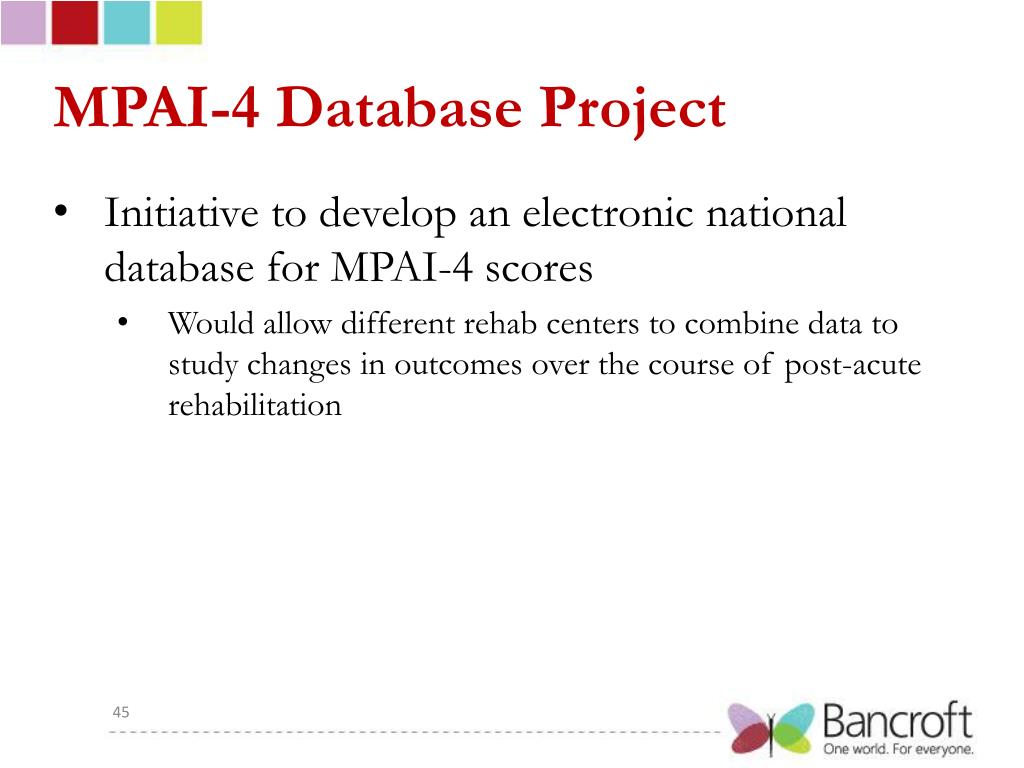 MPAI-4 Database Project • Initiative to develop an electronic national database for MPAI-4 scores • Would allow different rehab centers to combine data to study changes in outcomes over the course of post-acute rehabilitation