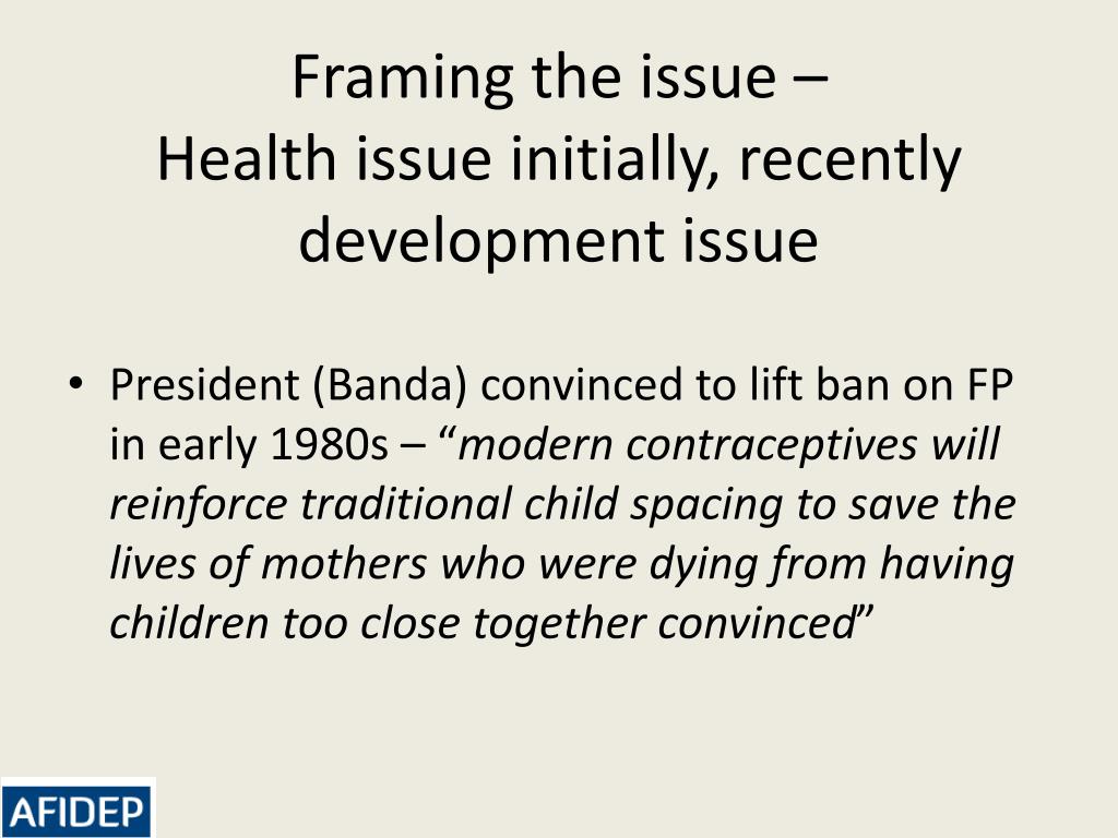 Framing the issue – Health issue initially, recently development issue • President (Banda) convinced to lift ban on FP in early 1980s – “modern contraceptives will reinforce traditional child spacing to save the lives of mothers who were dying from having children too close together convinced”