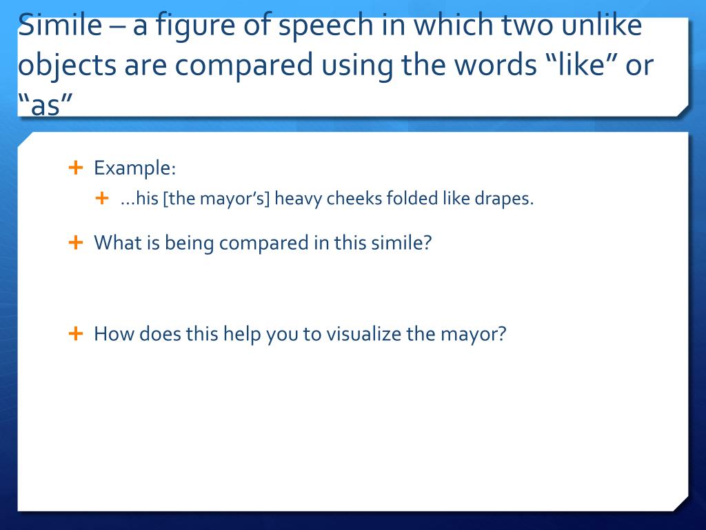 Simile – a figure of speech in which two unlike objects are compared using the words “like” or “as” • Example: • …his [the mayor’s] heavy cheeks folded like drapes. • What is being compared in this simile? • How does this help you to visualize the mayor?