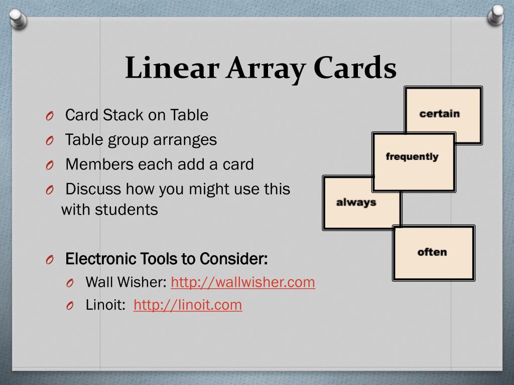 Linear Array Cards • Card Stack on Table • Table group arranges • Members each add a card • Discuss how you might use this with students • Electronic Tools to Consider: • Wall Wisher: http://wallwisher.com • Linoit: http://linoit.com