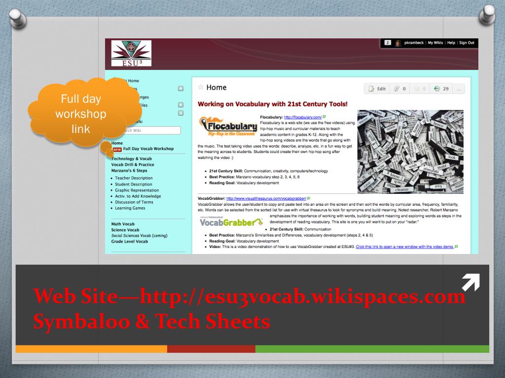 Full day workshop link Web Site—http://esu3vocab.wikispaces.comSymbaloo & Tech Sheets