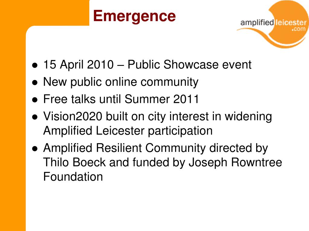 Emergence • 15 April 2010 – Public Showcase event • New public online community • Free talks until Summer 2011 • Vision2020 built on city interest in widening Amplified Leicester participation • Amplified Resilient Community directed by Thilo Boeck and funded by Joseph Rowntree Foundation