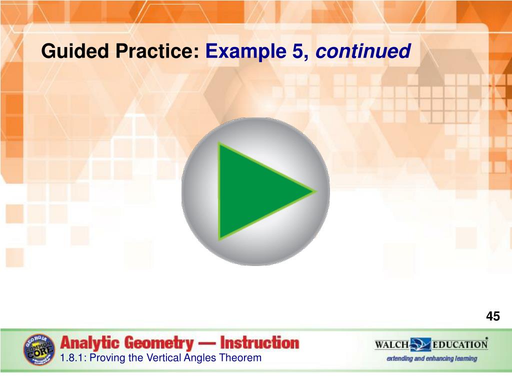 Guided Practice: Example 4, continued Use the definition of congruence. Since m∠1 = m∠3, by the definition of congruence, ∠1 and ∠3 are vertical angles and they are congruent. This proof also shows that angles supplementary to the same angle are congruent. ✔ 1.8.1: Proving the Vertical Angles Theorem