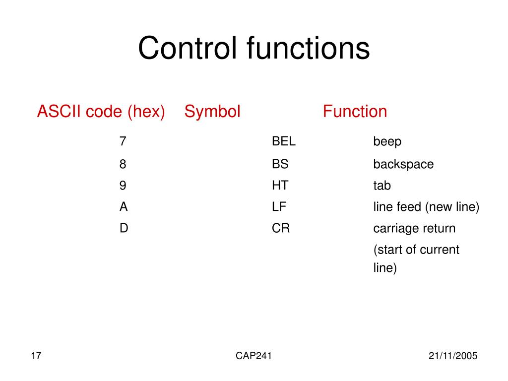 Control functions ASCII code (hex) Symbol Function 7 BEL beep 8 BS backspace 9 HT tab A LF line feed (new line) D CR carriage return (start of current line) CAP241