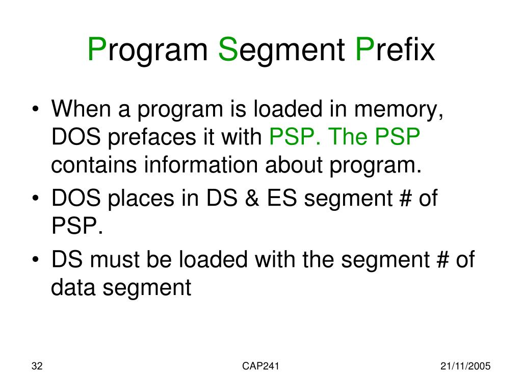 Program Segment Prefix • When a program is loaded in memory, DOS prefaces it with PSP. The PSP contains information about program. • DOS places in DS & ES segment # of PSP. • DS must be loaded with the segment # of data segment CAP241