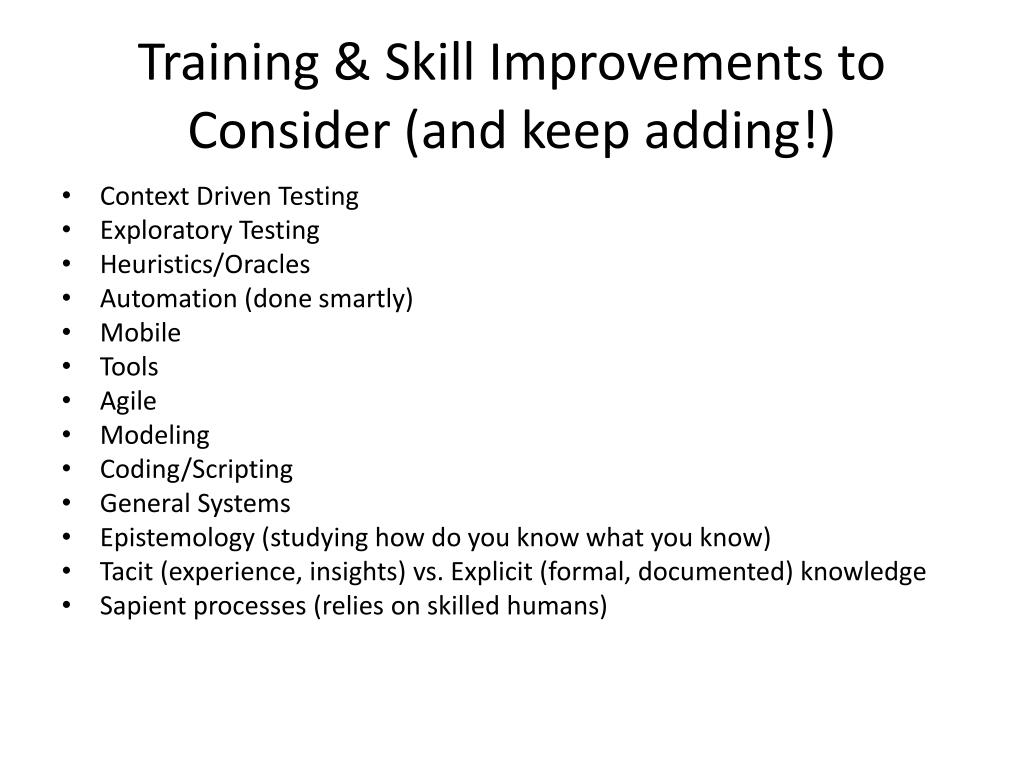 Training & Skill Improvements to Consider (and keep adding!) • Context Driven Testing • Exploratory Testing • Heuristics/Oracles • Automation (done smartly) • Mobile • Tools • Agile • Modeling • Coding/Scripting • General Systems • Epistemology (studying how do you know what you know) • Tacit (experience, insights) vs. Explicit (formal, documented) knowledge • Sapient processes (relies on skilled humans)