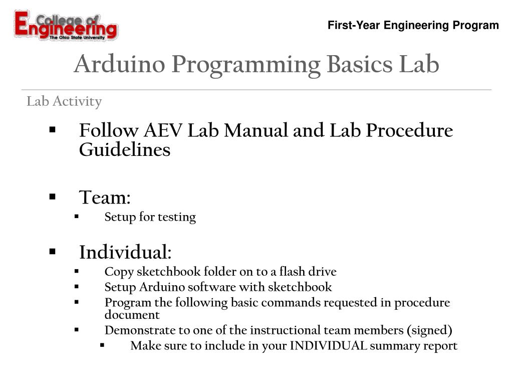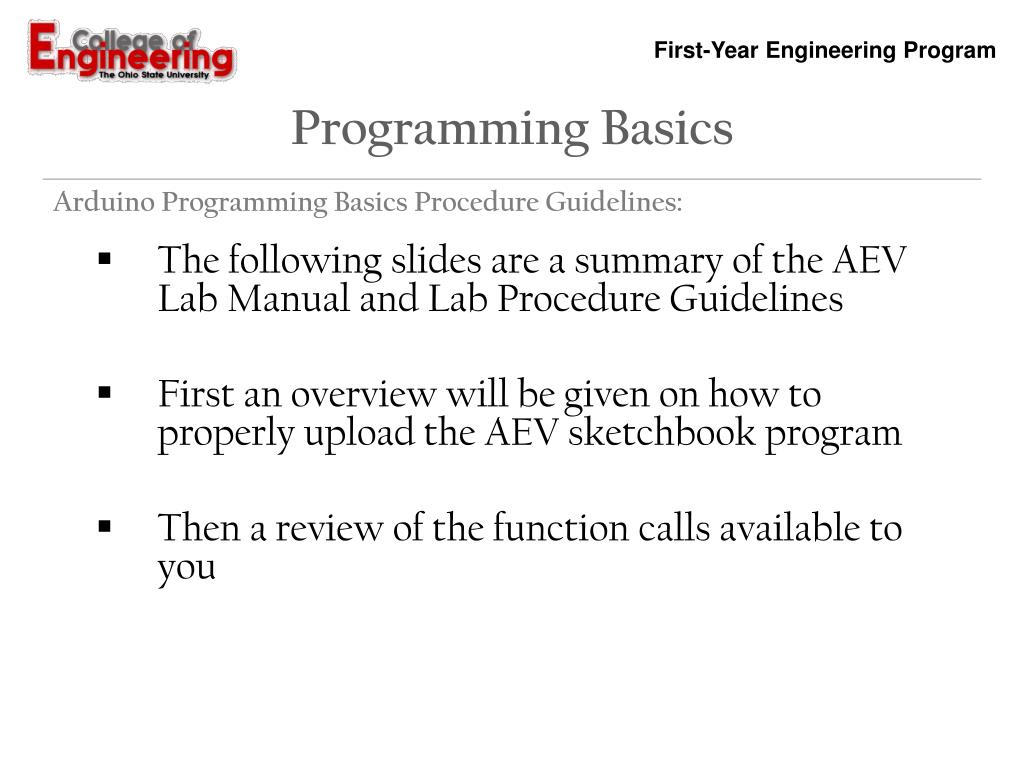Programming Basics Arduino Programming Basics Procedure Guidelines: • The following slides are a summary of the AEV Lab Manual and Lab Procedure Guidelines • First an overview will be given on how to properly upload the AEV sketchbook program • Then a review of the function calls available to you
