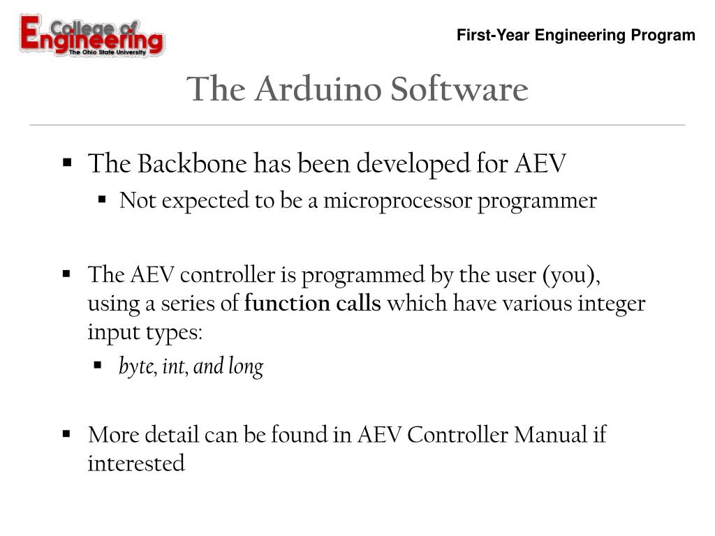 The Arduino Software • The Backbone has been developed for AEV • Not expected to be a microprocessor programmer • The AEV controller is programmed by the user (you), using a series of function calls which have various integer input types: • byte, int, and long • More detail can be found in AEV Controller Manual if interested