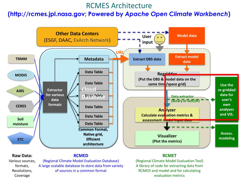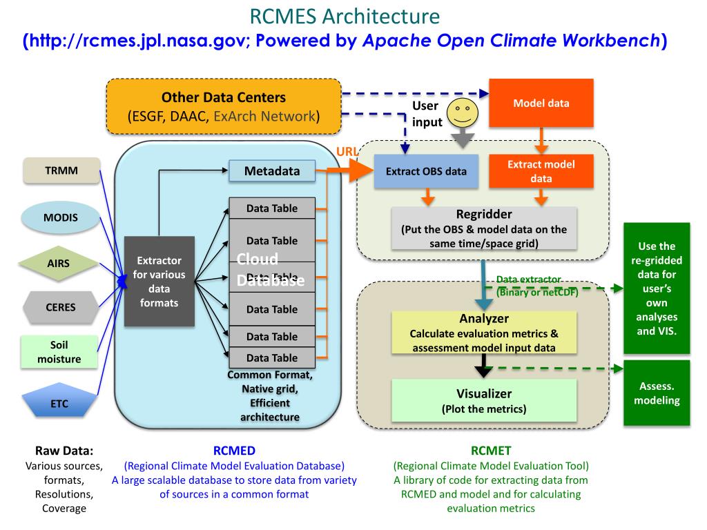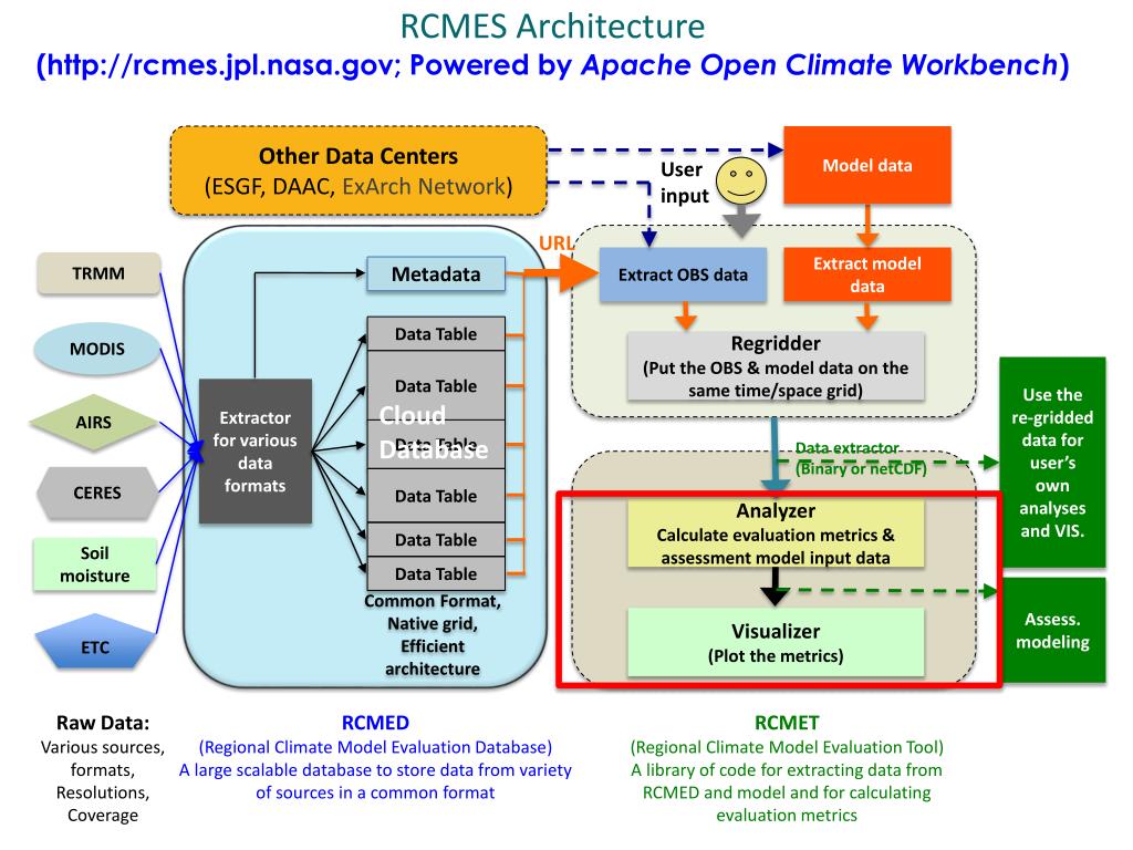 RCMESArchitecture(http://rcmes.jpl.nasa.gov; Powered by Apache Open Climate Workbench) Other Data Centers (ESGF, DAAC, ExArch Network) Model data User input URL Extract OBS data Extract model data TRMM Metadata Data Table MODIS Regridder (Put the OBS & model data on the same time/space grid) Data Table Use the re-gridded data for user’s own analyses and VIS. Extractor for various data formats Cloud Database AIRS Data Table Data extractor (Binary or netCDF) CERES Data Table Analyzer Calculate evaluation metrics & assessment model input data Data Table Soil moisture Data Table Assess. modeling Common Format, Native grid, Efficient architecture Visualizer (Plot the metrics) ETC RCMED (Regional Climate Model Evaluation Database) A large scalable database to store data from variety of sources in a common format RCMET (Regional Climate Model Evaluation Tool) A library of code for extracting data from RCMED and model and for calculating evaluation metrics Raw Data: Various sources, formats, Resolutions, Coverage