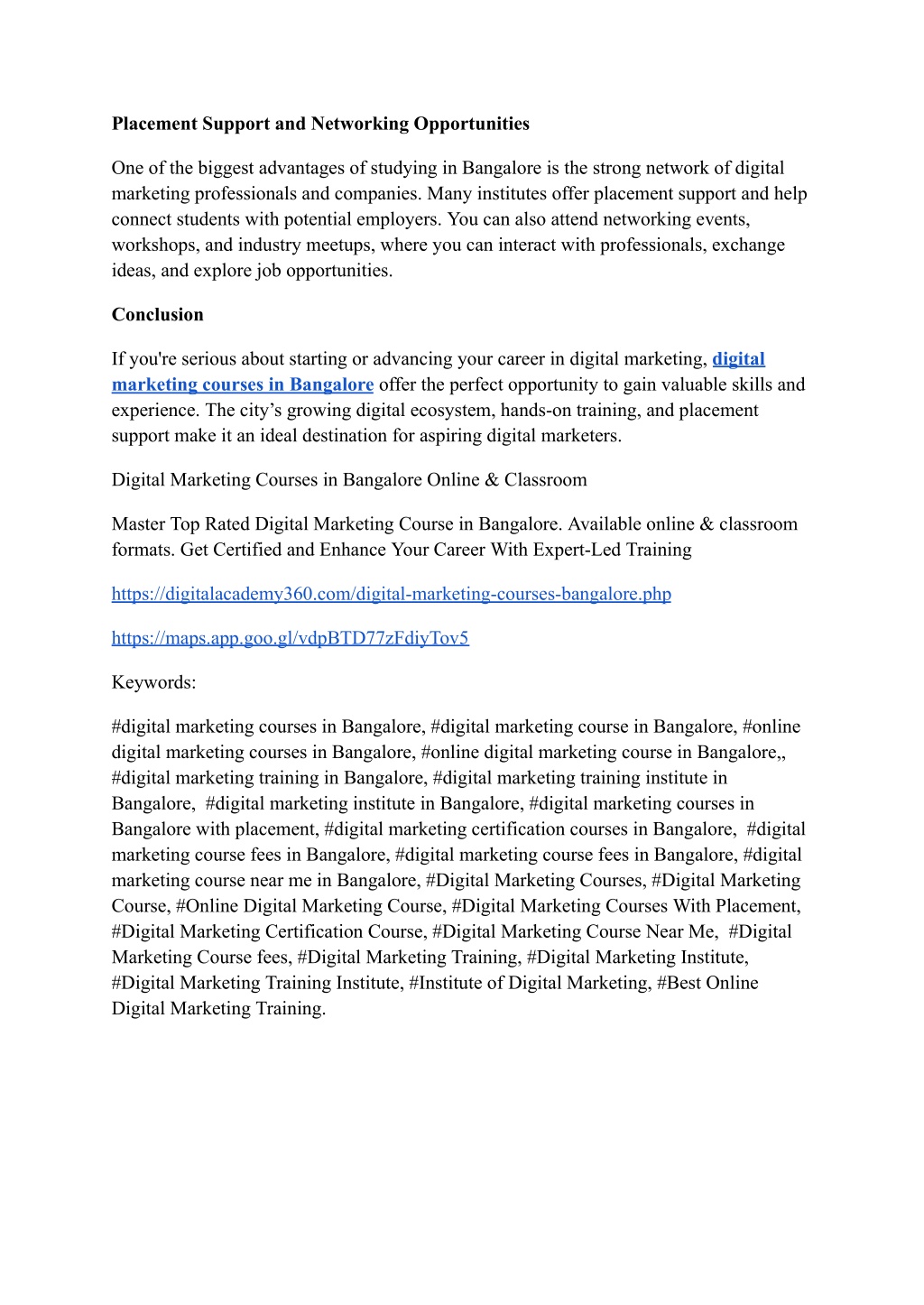 Placement Support and Networking Opportunities One of the biggest advantages of studying in Bangalore is the strong network of digital marketing professionals and companies. Many institutes offer placement support and help connect students with potential employers. You can also attend networking events, workshops, and industry meetups, where you can interact with professionals, exchange ideas, and explore job opportunities. Conclusion If you're serious about starting or advancing your career in digital marketing, digital marketing courses in Bangalore offer the perfect opportunity to gain valuable skills and experience. The city’s growing digital ecosystem, hands-on training, and placement support make it an ideal destination for aspiring digital marketers. Digital Marketing Courses in Bangalore Online & Classroom Master Top Rated Digital Marketing Course in Bangalore. Available online & classroom formats. Get Certified and Enhance Your Career With Expert-Led Training https://digitalacademy360.com/digital-marketing-courses-bangalore.php https://maps.app.goo.gl/vdpBTD77zFdiyTov5 Keywords: #digital marketing courses in Bangalore, #digital marketing course in Bangalore, #online digital marketing courses in Bangalore, #online digital marketing course in Bangalore,, #digital marketing training in Bangalore, #digital marketing training institute in Bangalore, #digital marketing institute in Bangalore, #digital marketing courses in Bangalore with placement, #digital marketing certification courses in Bangalore, #digital marketing course fees in Bangalore, #digital marketing course fees in Bangalore, #digital marketing course near me in Bangalore, #Digital Marketing Courses, #Digital Marketing Course, #Online Digital Marketing Course, #Digital Marketing Courses With Placement, #Digital Marketing Certification Course, #Digital Marketing Course Near Me, #Digital Marketing Course fees, #Digital Marketing Training, #Digital Marketing Institute, #Digital Marketing Training Institute, #Institute of Digital Marketing, #Best Online Digital Marketing Training.