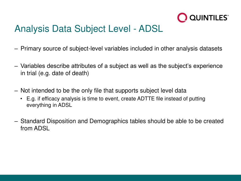 Analysis Data Subject Level - ADSL • Primary source of subject-level variables included in other analysis datasets • Variables describe attributes of a subject as well as the subject’s experience in trial (e.g. date of death) • Not intended to be the only file that supports subject level data • E.g. if efficacy analysis is time to event, create ADTTE file instead of putting everything in ADSL • Standard Disposition and Demographics tables should be able to be created from ADSL