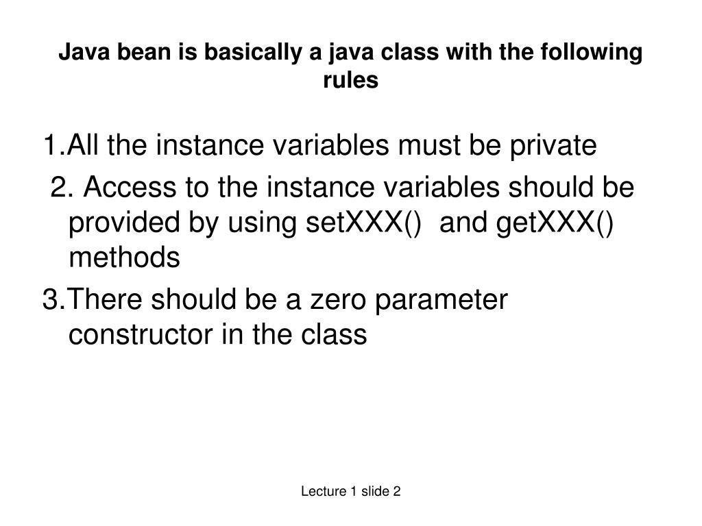 Java bean is basically a java class with the following rules 1.All the instance variables must be private 2. Access to the instance variables should be provided by using setXXX() and getXXX() methods 3.There should be a zero parameter constructor in the class Lecture 1 slide 2
